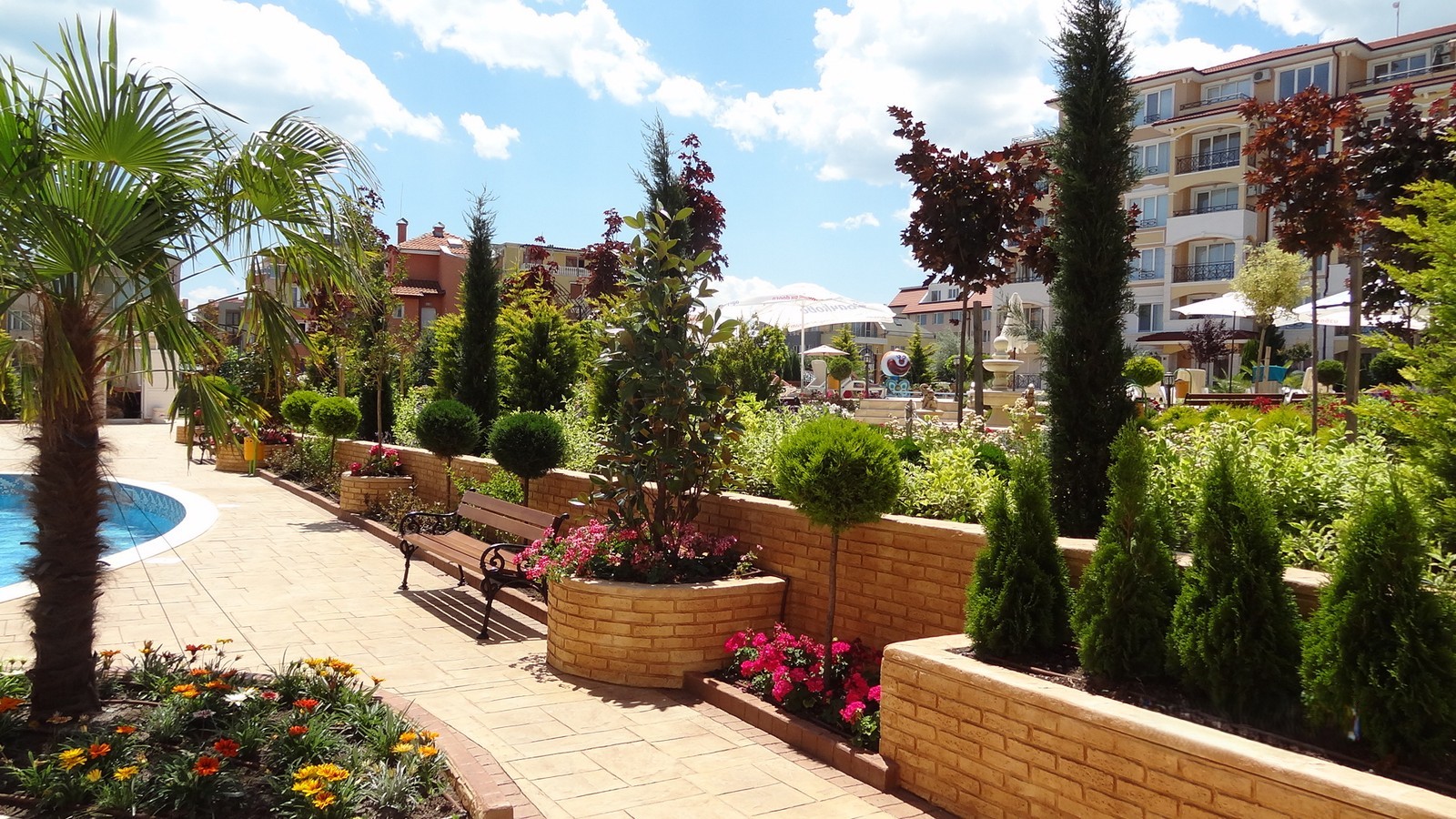 Территория комплекса закрытая и доступна только для собственников и гостей. Пространство благоустроено и озеленено, с использованием ландшафтного дизайна и экзотических растений. На территории расположены бассейн с детской секцией, зона для отдыха и загара с шезлонгами, детская площадка, прогулочные аллеи, парковочные места, а также предусмотрены охрана, видеонаблюдение и круглогодичное обслуживание управляющей компанией.