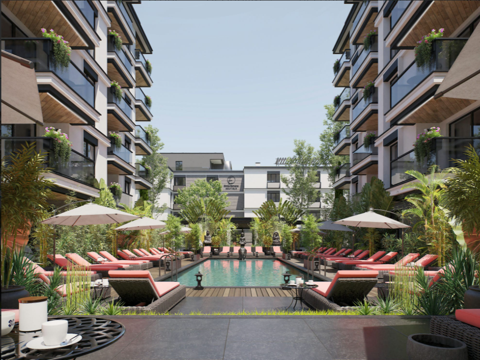 Архитектура комплекса отличается современным стилем и визуальной лёгкостью. В отделке фасадов используются качественные материалы, подчеркивающие статус проекта и его курортный характер. Особое внимание уделено внутреннему пространству — минимизация общих зон позволяет увеличить полезную площадь апартаментов.