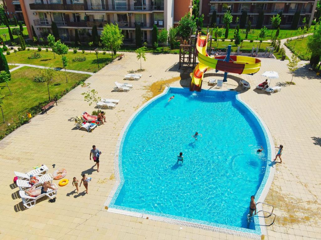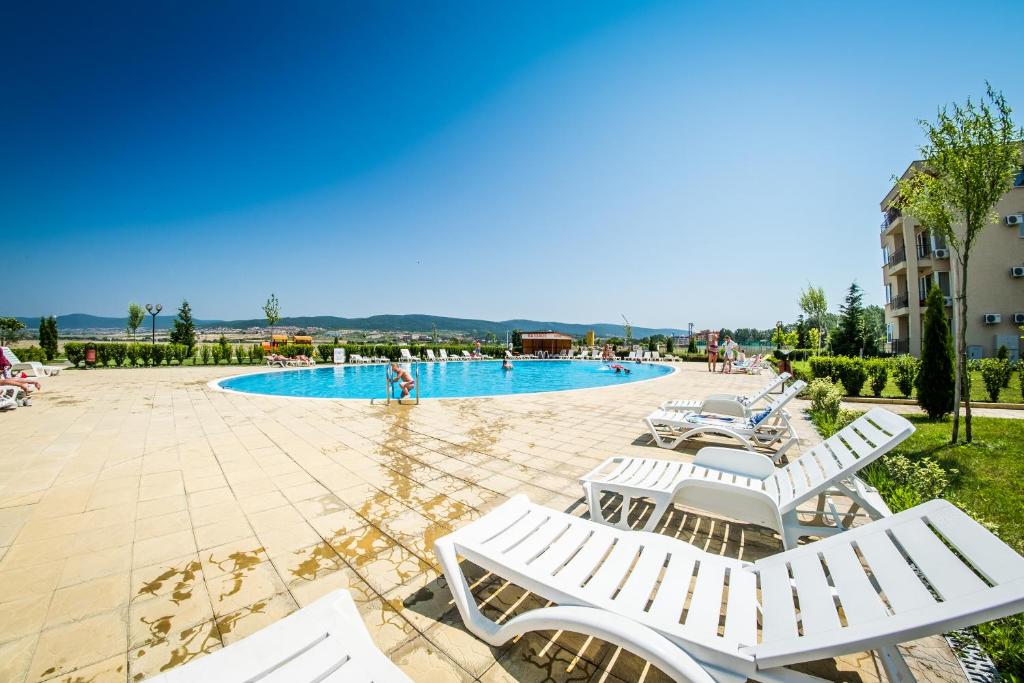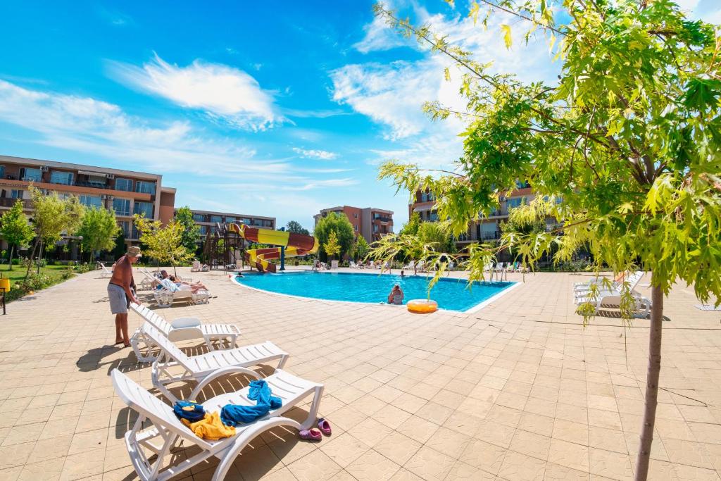 Комплекс расположен рядом с главной дорогой Бургас–Варна, что обеспечивает удобную транспортную доступность. До пляжа можно дойти за 15–20 минут.