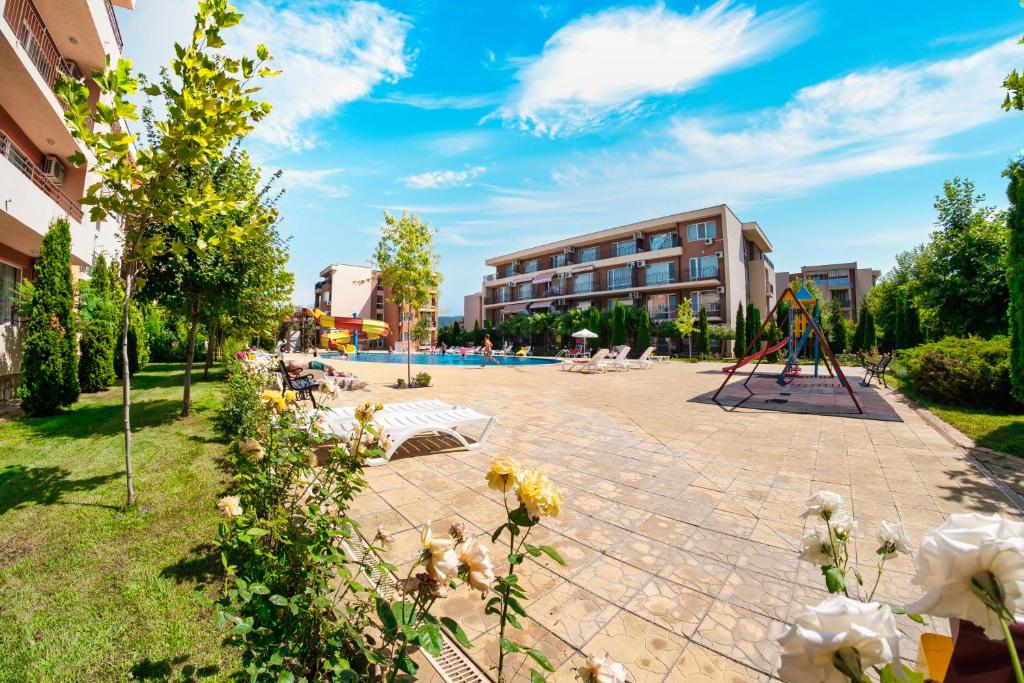 Озеленённая территория комплекса и соседнего проекта занимает около 45 000 кв.м, создавая одну из самых зелёных и благоустроенных жилых зон в районе Несебра.