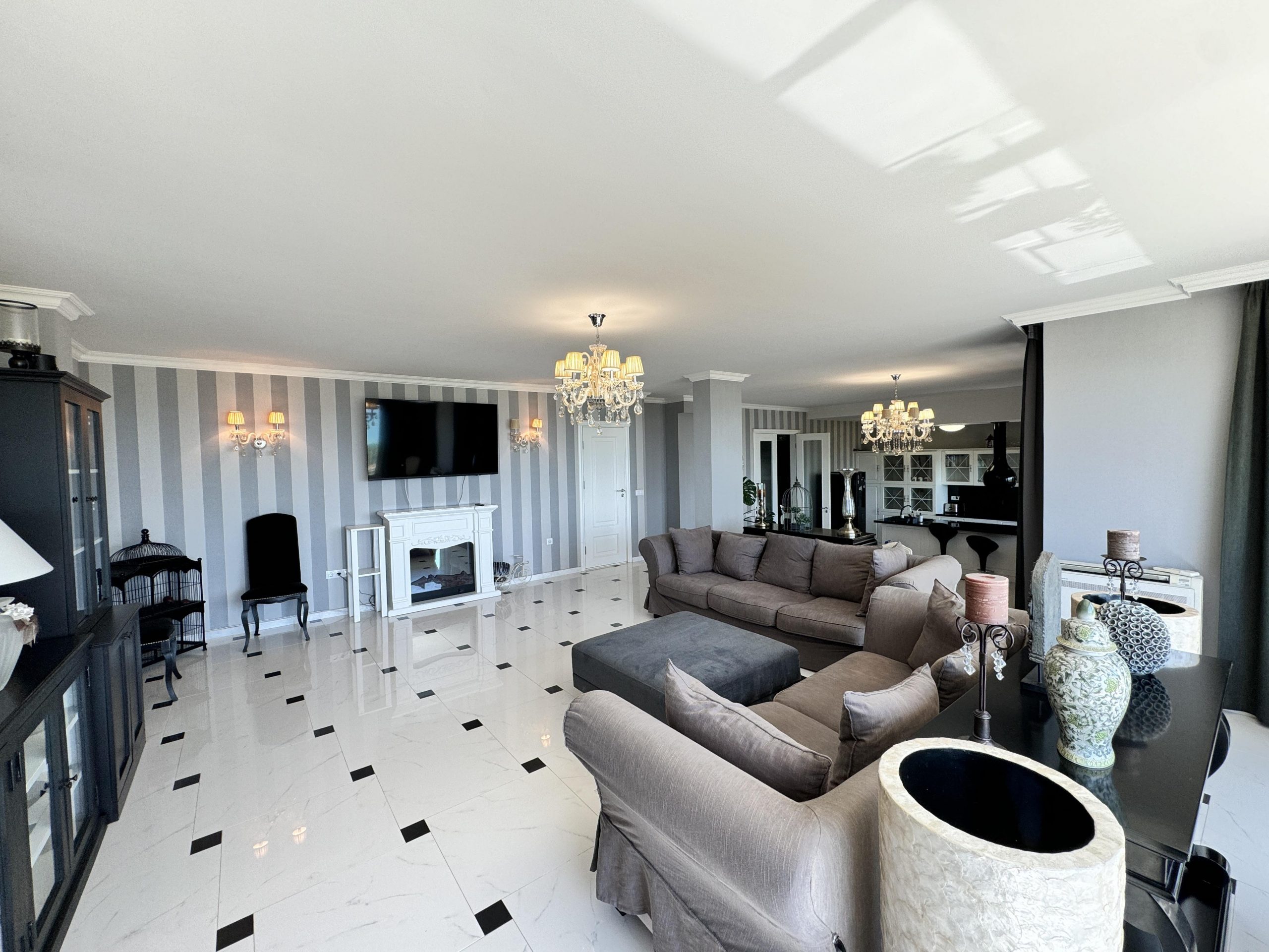 Просторная гостиная с кухней и террасой с видом на залив.