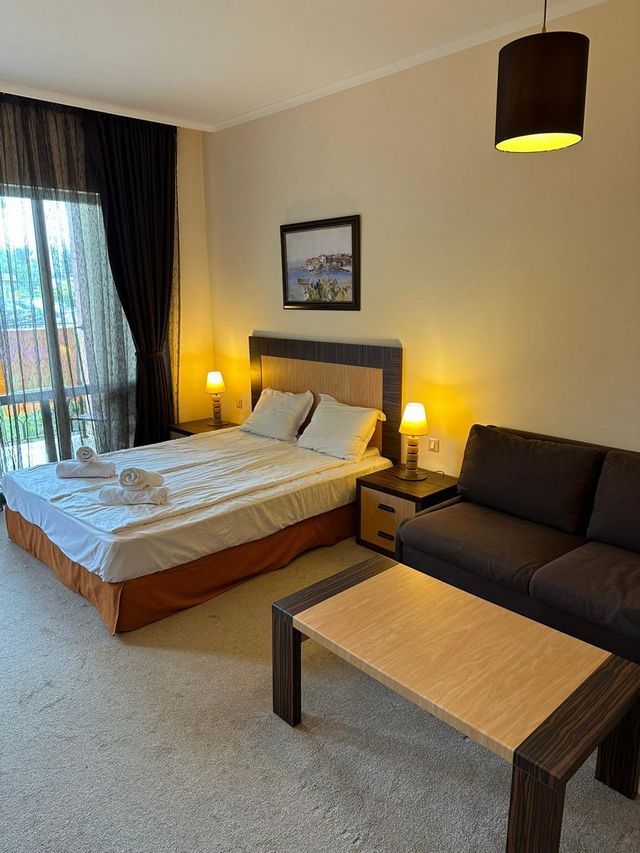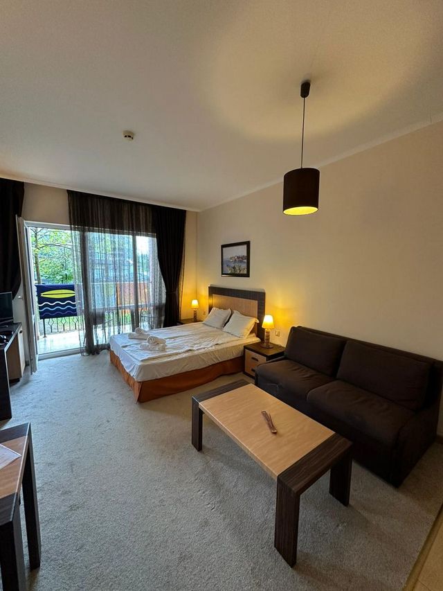 Продаётся светлая студия в комплексе Majestic на курорте Солнечный берег. Общая площадь — 47 м², апартамент находится на партёрном этаже и продаётся с мебелью.