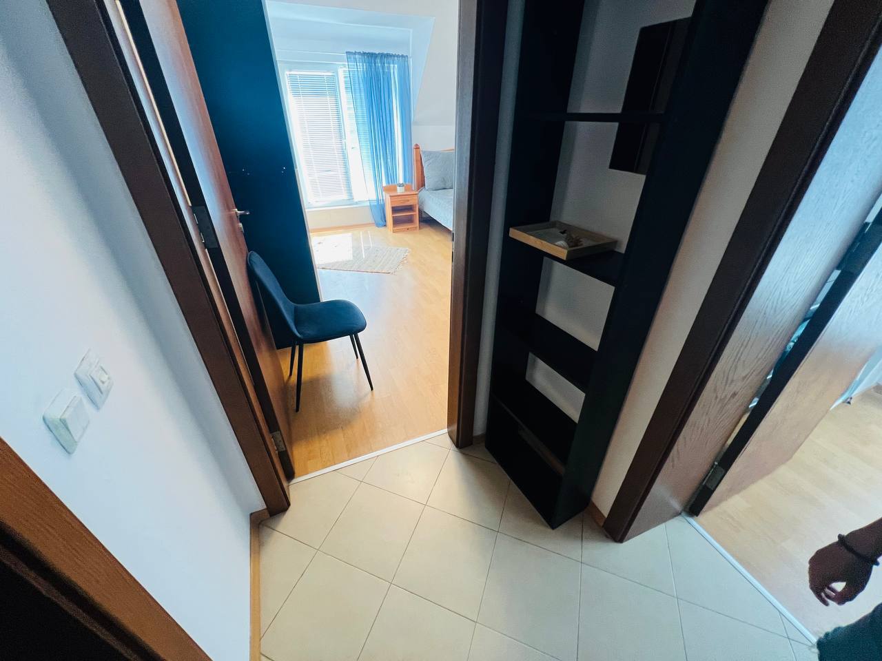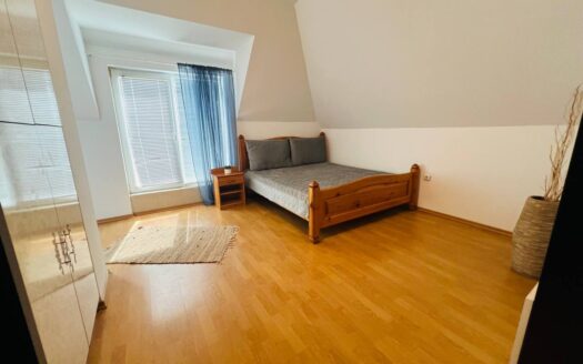 Продаётся двухкомнатный апартамент в комплексе «Лагуна» в Солнечном Береге. Квартира на пятом этаже с площадью 63 м² включает гостиную с кухонной зоной, отдельную спальню, ванную комнату и балкон с видом на улицу.