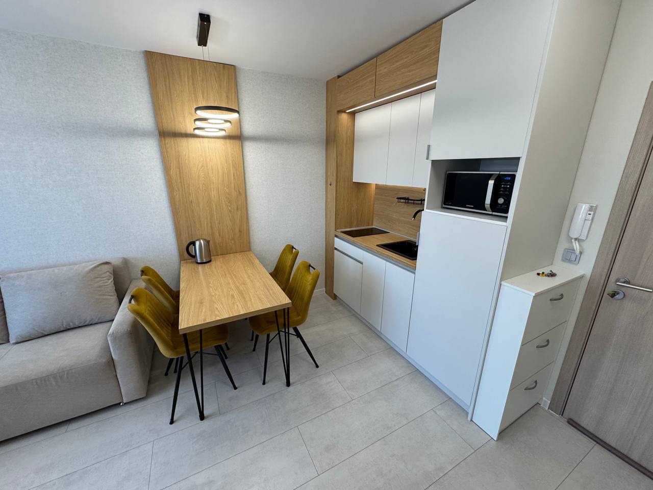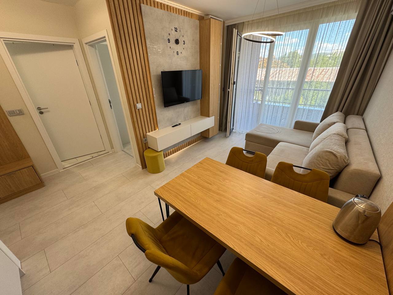 Апартамент включает в себя все необходимое для комфортного проживания. Планировка состоит из светлой гостиной с кухонной и обеденной зонами, отдельной спальни, ванной комнаты и балкона. Благодаря удачному распределению пространства жильё выглядит просторным и уютным. Квартира полностью меблирована и оснащена бытовой техникой, что позволяет сразу же после покупки заселиться или использовать её в качестве объекта для сдачи в аренду. Это избавляет будущего владельца от дополнительных затрат на ремонт или оборудование.