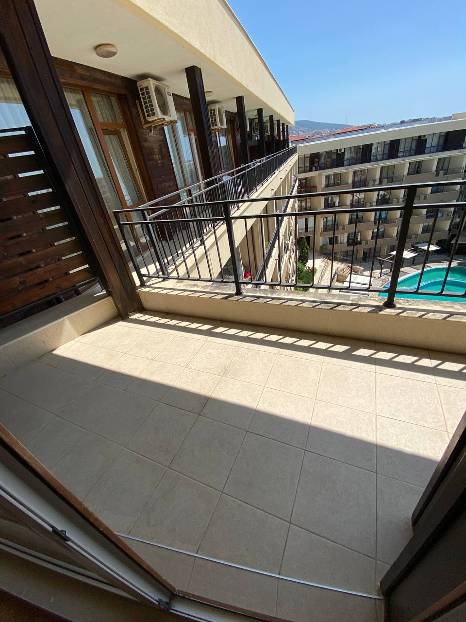 Балкон с видом на море и бассейн станет отличным местом для утреннего кофе или вечернего отдыха.