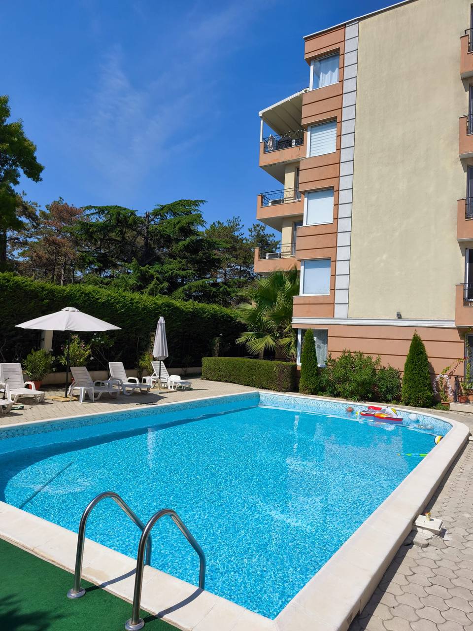 Комплекс находится в спокойной части города, недалеко от моря и развитой инфраструктуры: магазинов, аптек, кафе, ресторанов, остановок общественного транспорта. Пешая доступность до пляжа делает объект удобным для отдыха или сдачи в аренду.