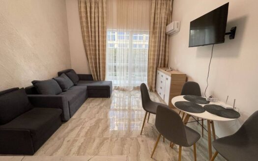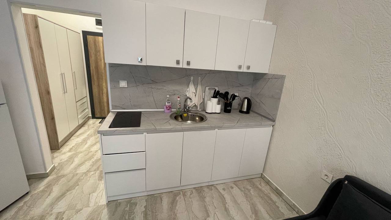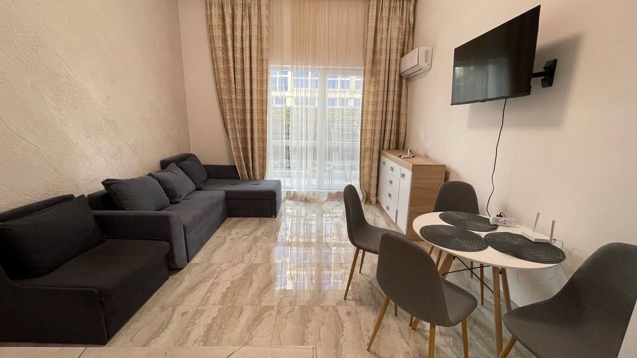 Студия выполнена в современном стиле и идеально подходит как для проживания, так и для отдыха у моря. Пространство позволяет комфортно разместить зону отдыха, кухню и место для сна, сохраняя при этом ощущение свободы. Высокие потолки создают эффект объёма и дают возможность реализовать интересные дизайнерские решения.