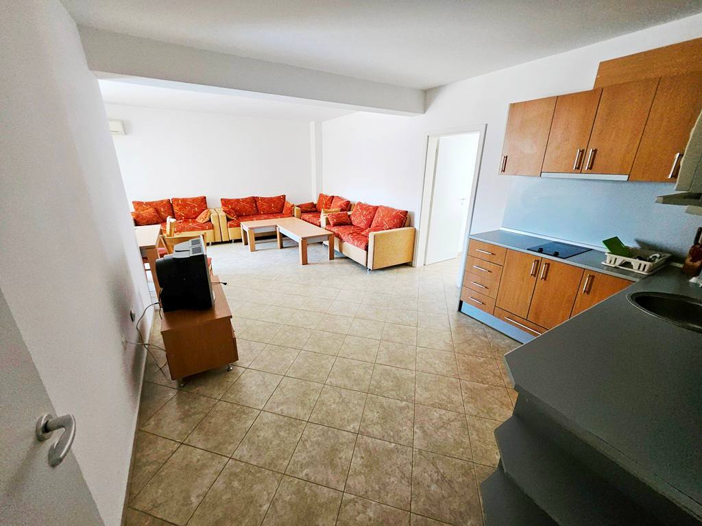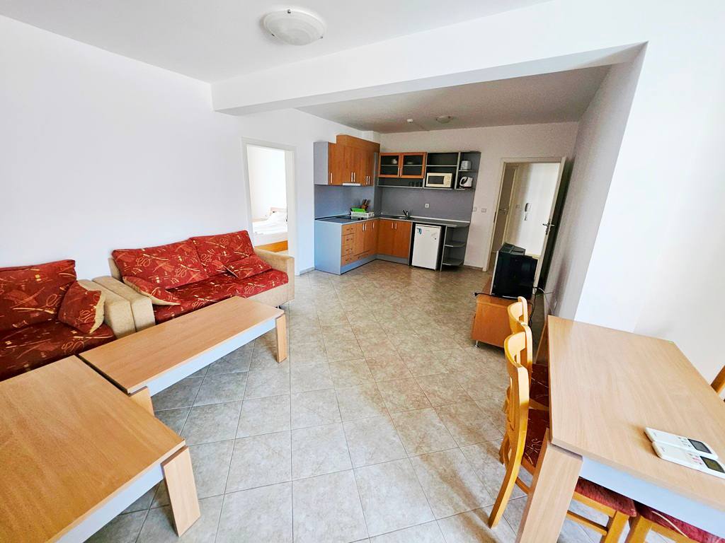 Квартира включает светлую гостиную с кухонной зоной, две отдельные спальни, ванную комнату и большую террасу. Планировка функциональная — просторная гостиная идеально подходит для семейного отдыха, а спальни обеспечивают уединение.