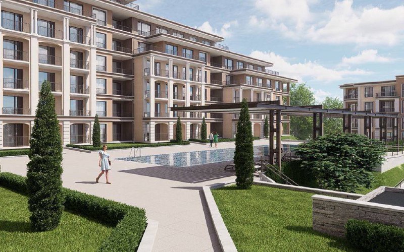 Предлагается двухкомнатная квартира в новом комплексе Fort Noks Green Suites, расположенном в элитном квартале Святого Власа. Апартамент находится на 4 этаже и имеет площадь 57 кв. м. Стоимость составляет 147 000 евро, годовая такса обслуживания — 16 евро за квадратный метр. Доступна рассрочка на 3 года без процентов от застройщика.
