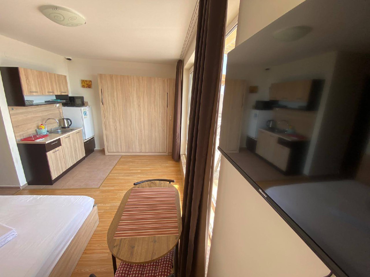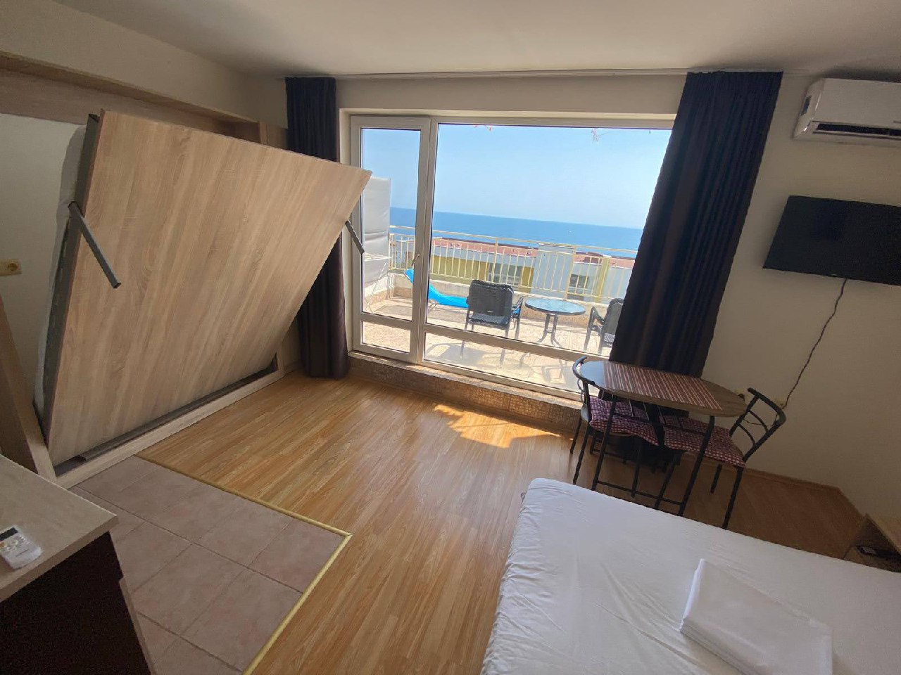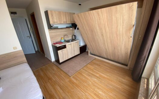 Студия имеет удобное зонирование: кухня, жилая и спальная зоны, а также балкон с видом на море. Это делает её идеальной для постоянного проживания или аренды.