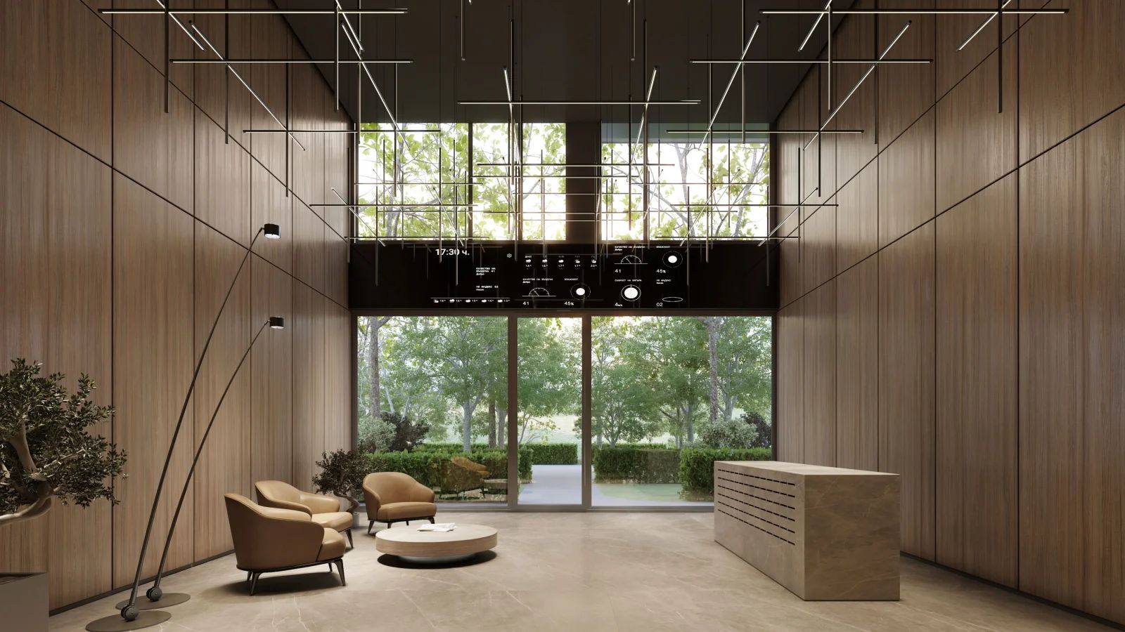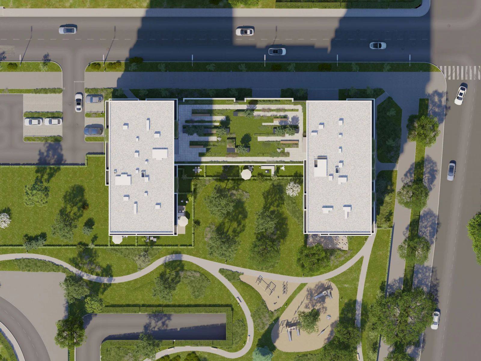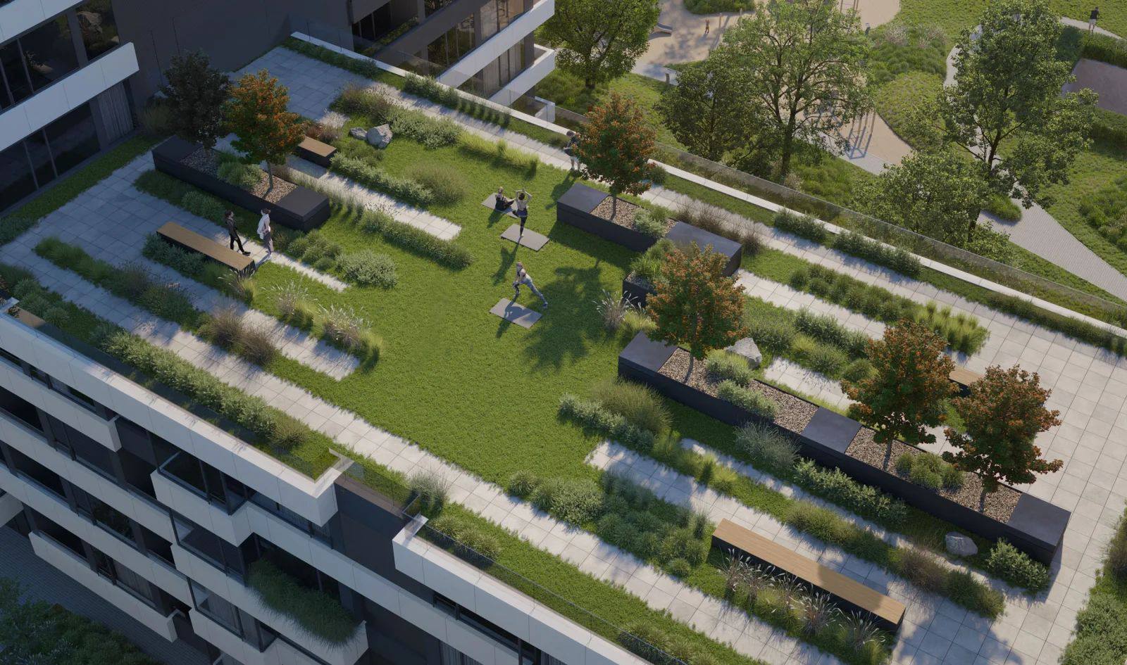 Частный парк площадью 5 845 м² с аллеями и зонами отдыха создает приватную атмосферу для жителей.