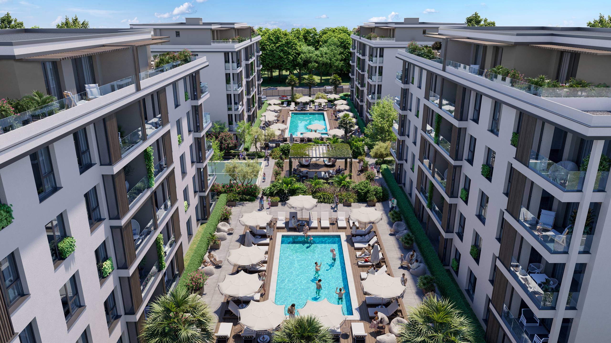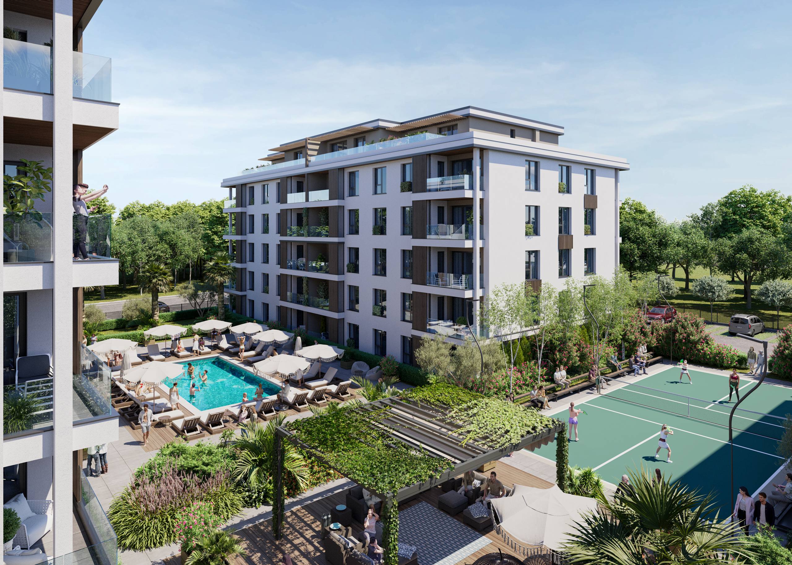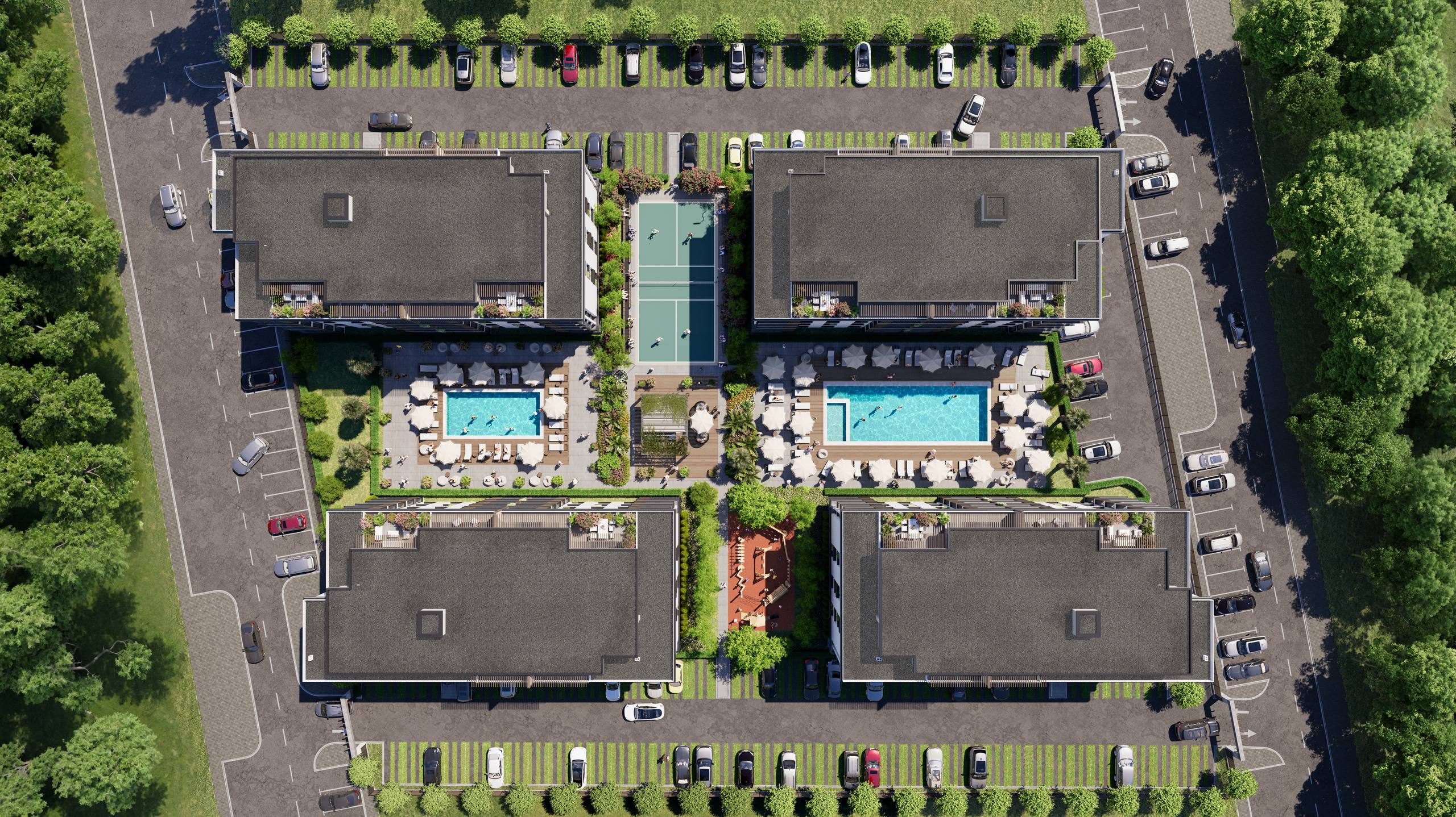 Paradise Residence 2 — это современный жилой комплекс, состоящий из четырёх зданий, расположенных на закрытой и благоустроенной территории. Особое внимание уделено озеленению, созданию зон отдыха и прогулочных аллей. На территории комплекса находятся два бассейна — основной размером 20 × 7,5 метров и дополнительный 12 × 6 метров, что обеспечивает комфортное купание в течение длительного сезона. Для семей с детьми предусмотрена детская площадка, а любители активного отдыха оценят спортивную площадку для пиклбола и бадминтона. Также организована парковка для жителей и гостей, а круглосуточная охрана гарантирует безопасность и спокойствие.