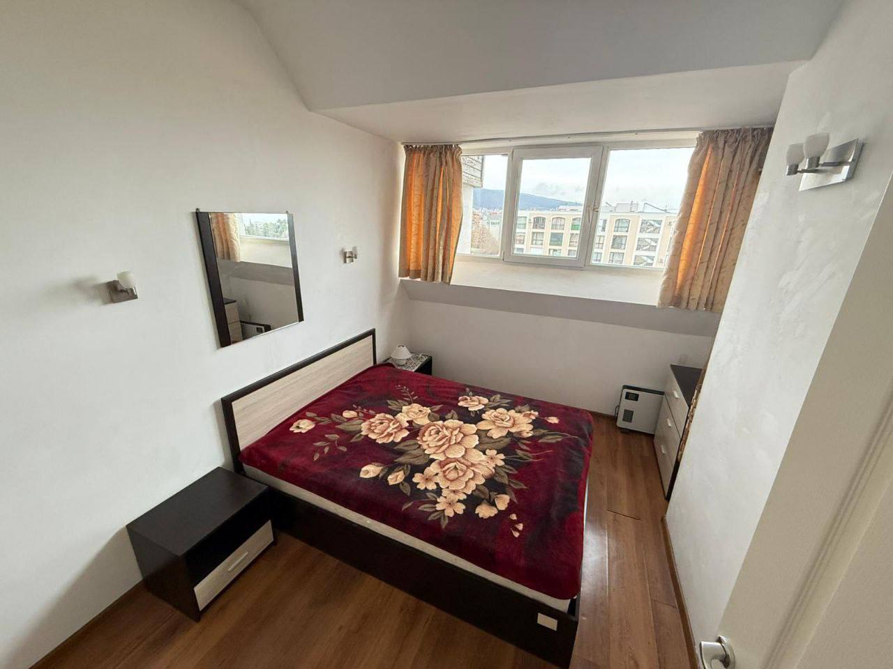 Квартира имеет общую площадь 58,4 м² и классическую планировку, включающую гостиную с кухонной зоной и отдельную спальню. Такой формат остаётся востребованным на рынке недвижимости в Болгарии, так как подходит для пары, небольшой семьи или арендаторов. Расположение на шестом этаже из шести обеспечивает дополнительную тишину и приватность, отсутствуют соседи сверху, что особенно ценится покупателями, предпочитающими спокойствие.