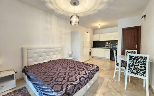 Студия находится на партерном этаже и занимает площадь 35 м². Планировка продумана с учётом максимального комфорта: пространство разделено на зону отдыха, кухонный уголок и место для хранения вещей. Отдельным преимуществом является уютный балкон с видом на бассейн, который расширяет жилую площадь и создаёт приятную атмосферу для отдыха. Такой формат квартиры в Солнечном Береге подходит как для жизни, так и для аренды, обеспечивая удобство и функциональность.