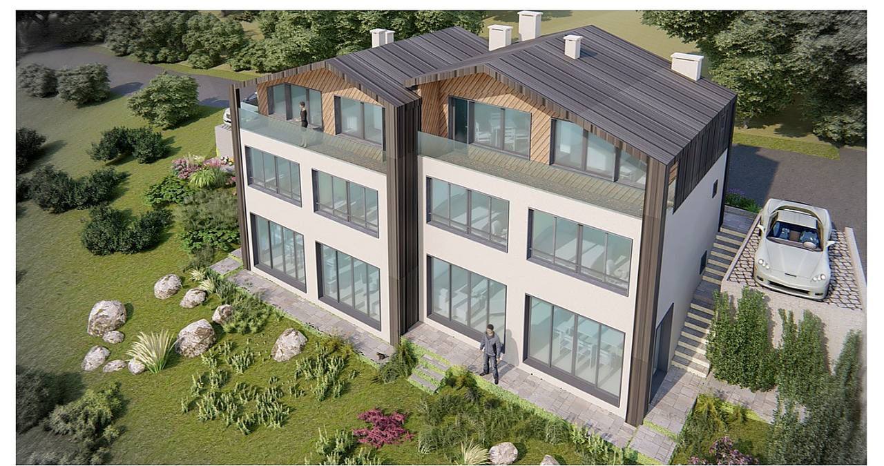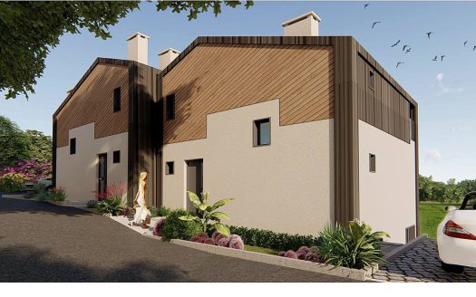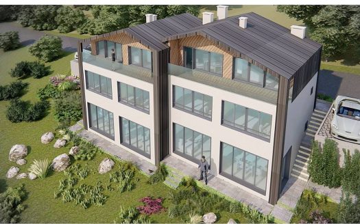 Каждая къща представляет собой трёхуровневый жилой дом с продуманной планировкой. Общая площадь застроенной части составляет 181 м². В доме предусмотрены просторные комнаты с большими панорамными окнами, что обеспечивает естественное освещение и ощущение простора. Формат недвижимости позволяет использовать дом как квартиру для жизни или аренды. Каждый дом располагается на отдельном участке с собственным двором площадью 230 м² для первой къщи и 215 м² для второй. Это обеспечивает приватность и возможность организации зоны отдыха или озеленения.