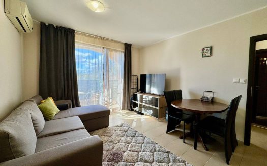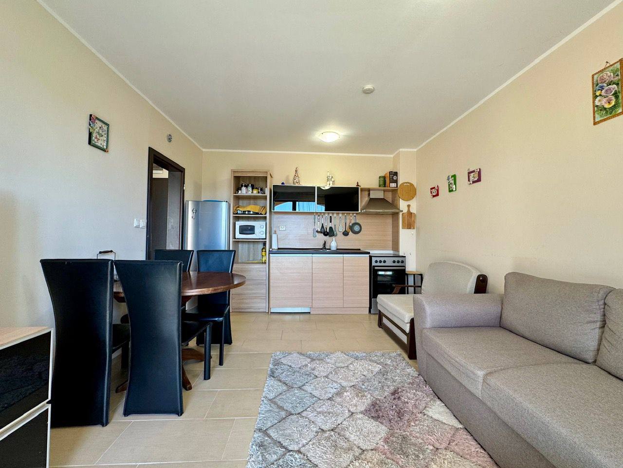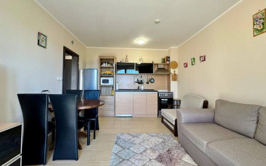 Квартира имеет классическую планировку с гостиной, объединённой с кухонной зоной, и отдельной спальней. Общая площадь составляет 52 квадратных метра, что обеспечивает достаточно пространства для комфортного проживания. Расположена на пятом этаже, что обеспечивает хороший уровень приватности, достаточное естественное освещение и свежий воздух. Такой формат квартиры в Солнечном Береге подходит как для жизни у моря, так и для сезонной аренды, благодаря удобному расположению и функциональному дизайну.