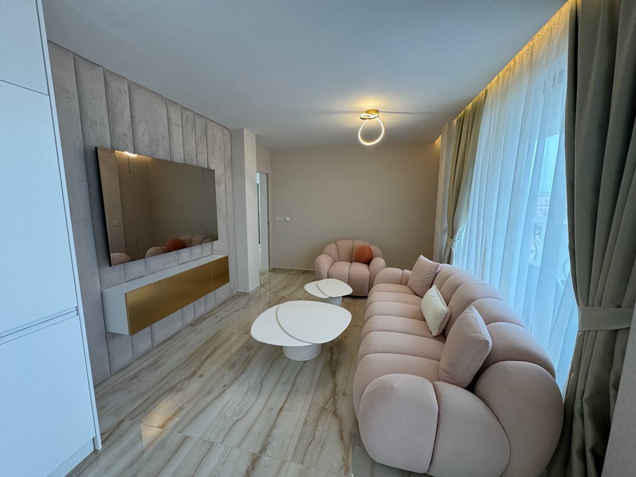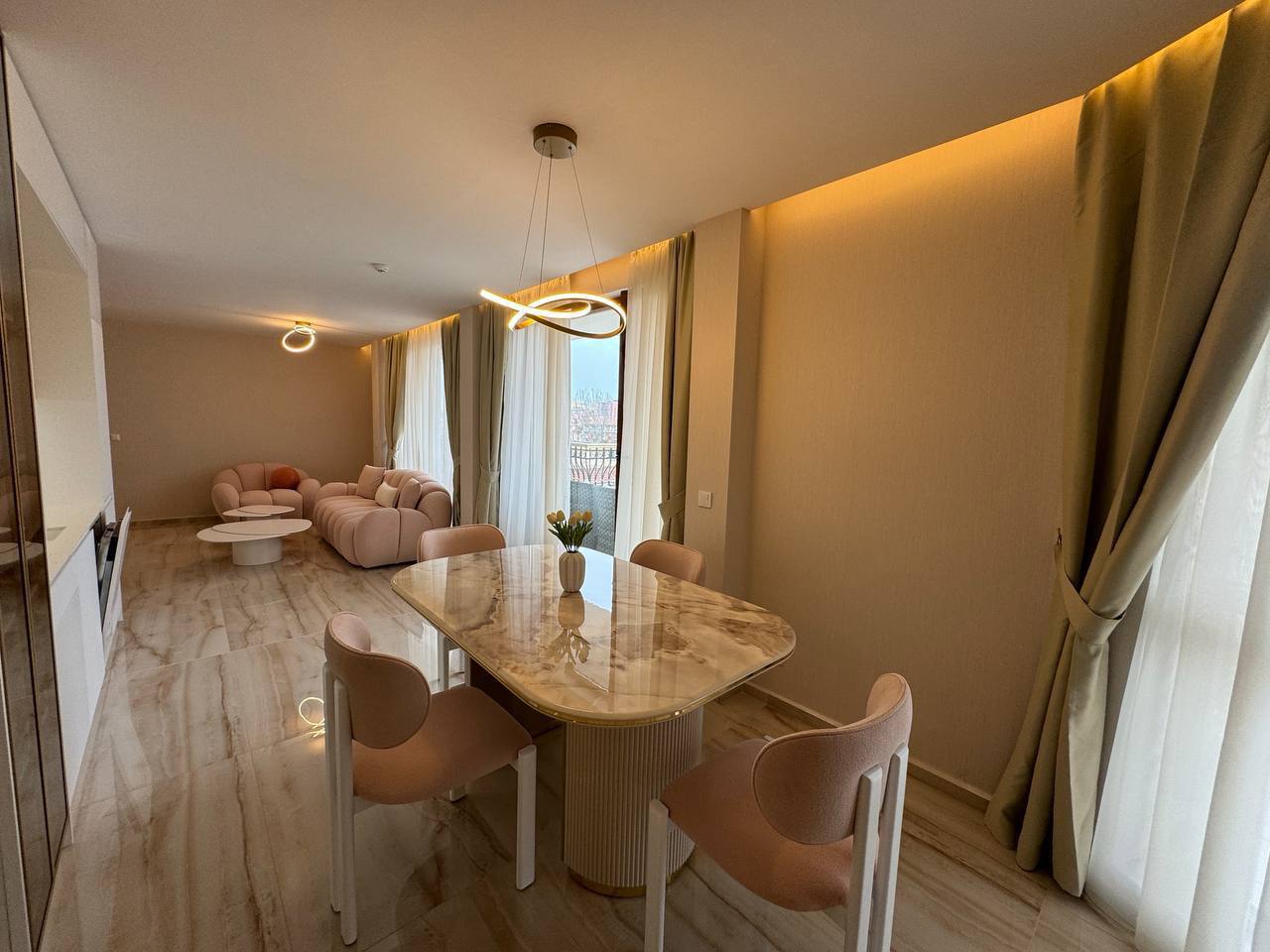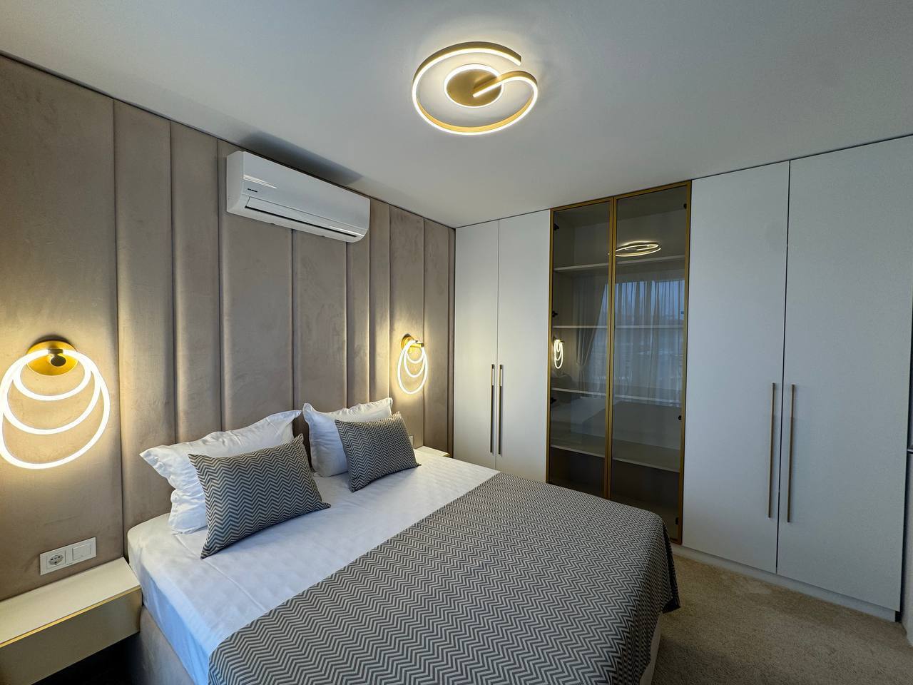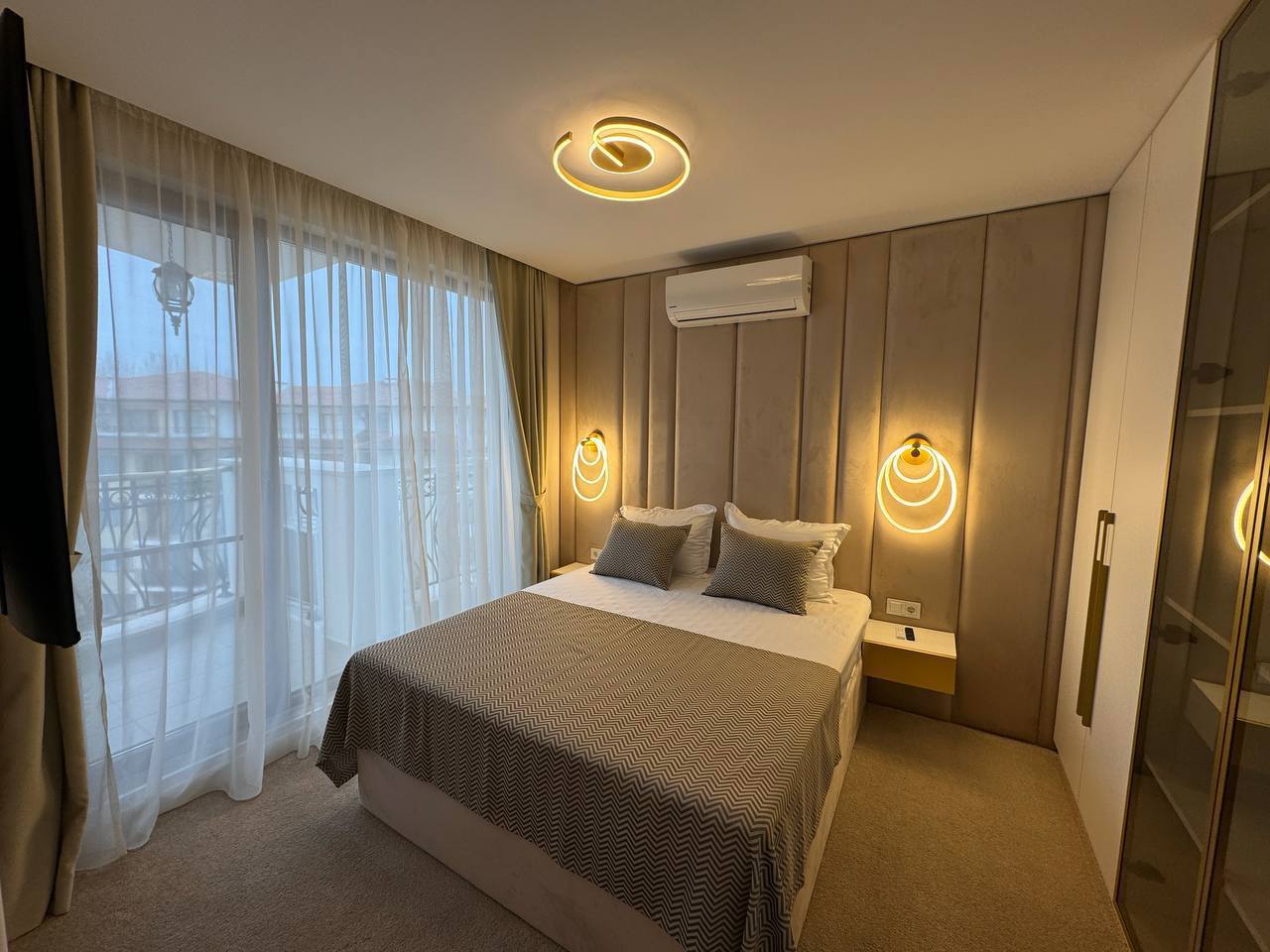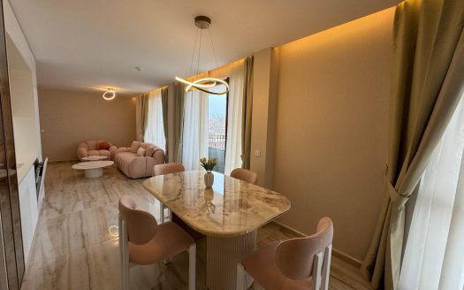 Квартира занимает общую площадь 121 м² и включает просторную гостиную с кухонной зоной, две отдельные спальни, гардеробную и два полноценных санузла. Планировка продумана до мелочей, что обеспечивает удобство и комфорт для семьи или арендаторов. Обширный балкон площадью 18,72 м² служит полноценной зоной отдыха, где можно организовать лаунж-зону или обеденную группу. Квартира находится на удобном этаже комплекса и готова к круглогодичному проживанию благодаря установленному тёплому полу и использованию натуральных материалов в отделке.