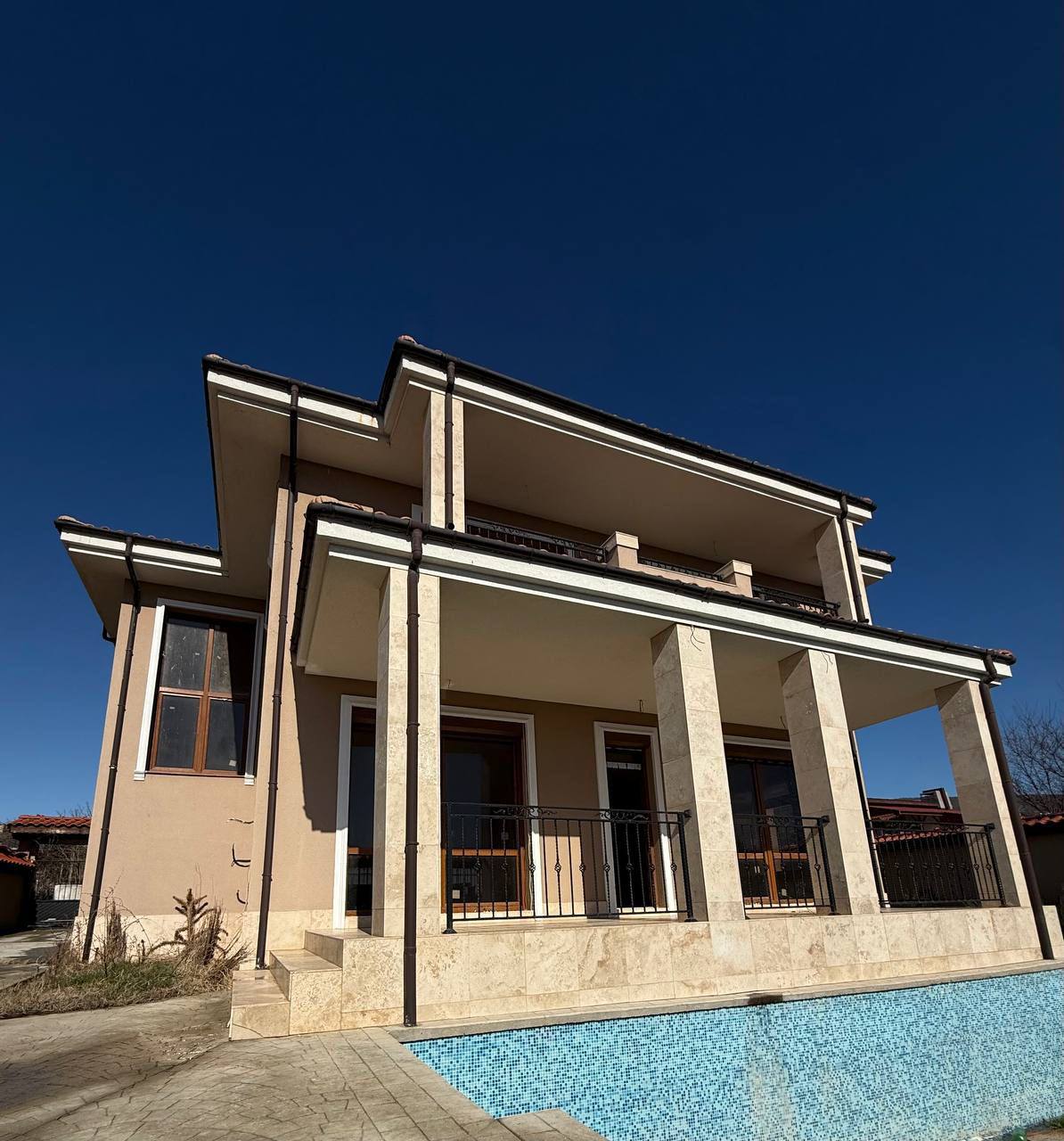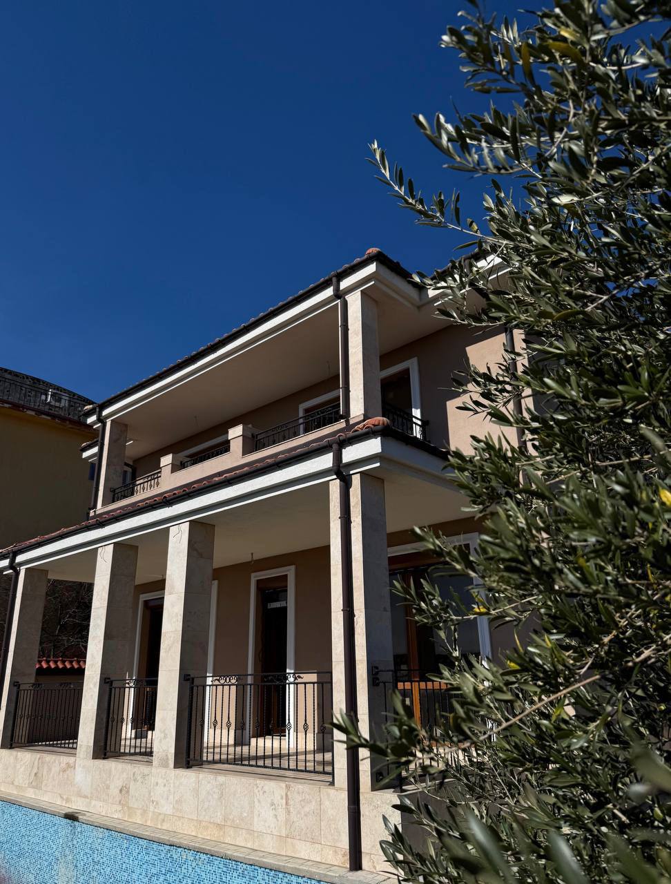 Дом расположен на участке площадью 450 м² с собственным бассейном, что создаёт комфортные условия для жизни и отдыха. В доме подведены все необходимые коммуникации: электричество, вода и канализация. Стены утеплены, что позволяет использовать недвижимость круглый год. Внутреннее состояние — черновая отделка с антигрибковой пропиткой, выполнена разводка электрики, подготовлены выводы под кондиционеры и отопление. На первом этаже предусмотрена система тёплых полов, что создаёт удобную базу для дальнейшей отделки по индивидуальному проекту.