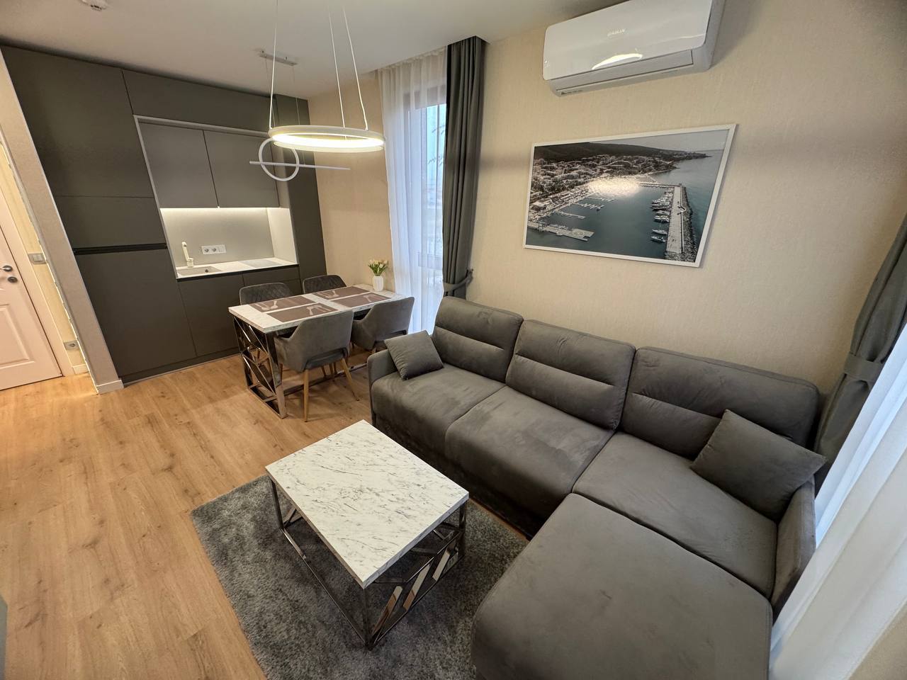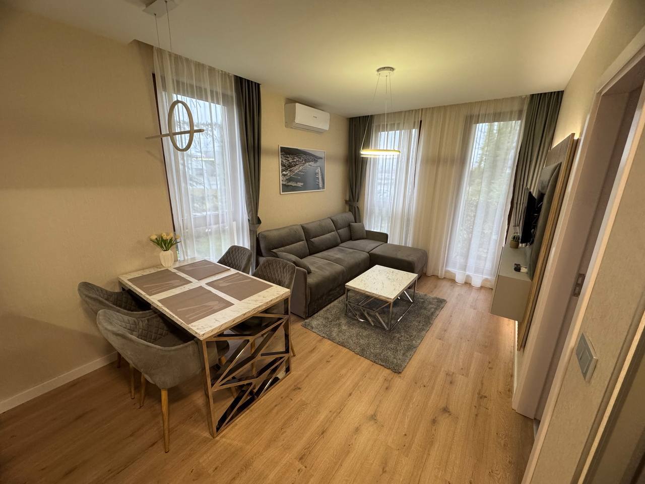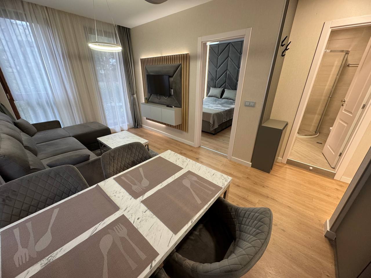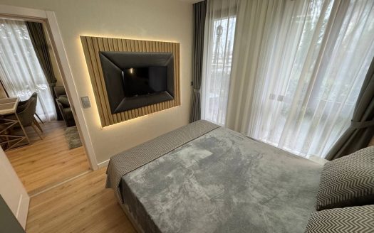 Квартира находится на первом этаже и имеет площадь 45 квадратных метров. Планировка включает гостиную с кухонной зоной и отдельную спальню, что обеспечивает удобное и функциональное пространство. Несмотря на компактный размер, квартира рационально организована, без лишних пустот и «мертвых» зон, что делает ее комфортной для проживания пары или использования в качестве сезонного жилья. Первый этаж обеспечивает быстрый доступ к территории комплекса, что особенно ценно для отдыхающих и арендаторов, предпочитающих отсутствие необходимости пользоваться лифтом.
