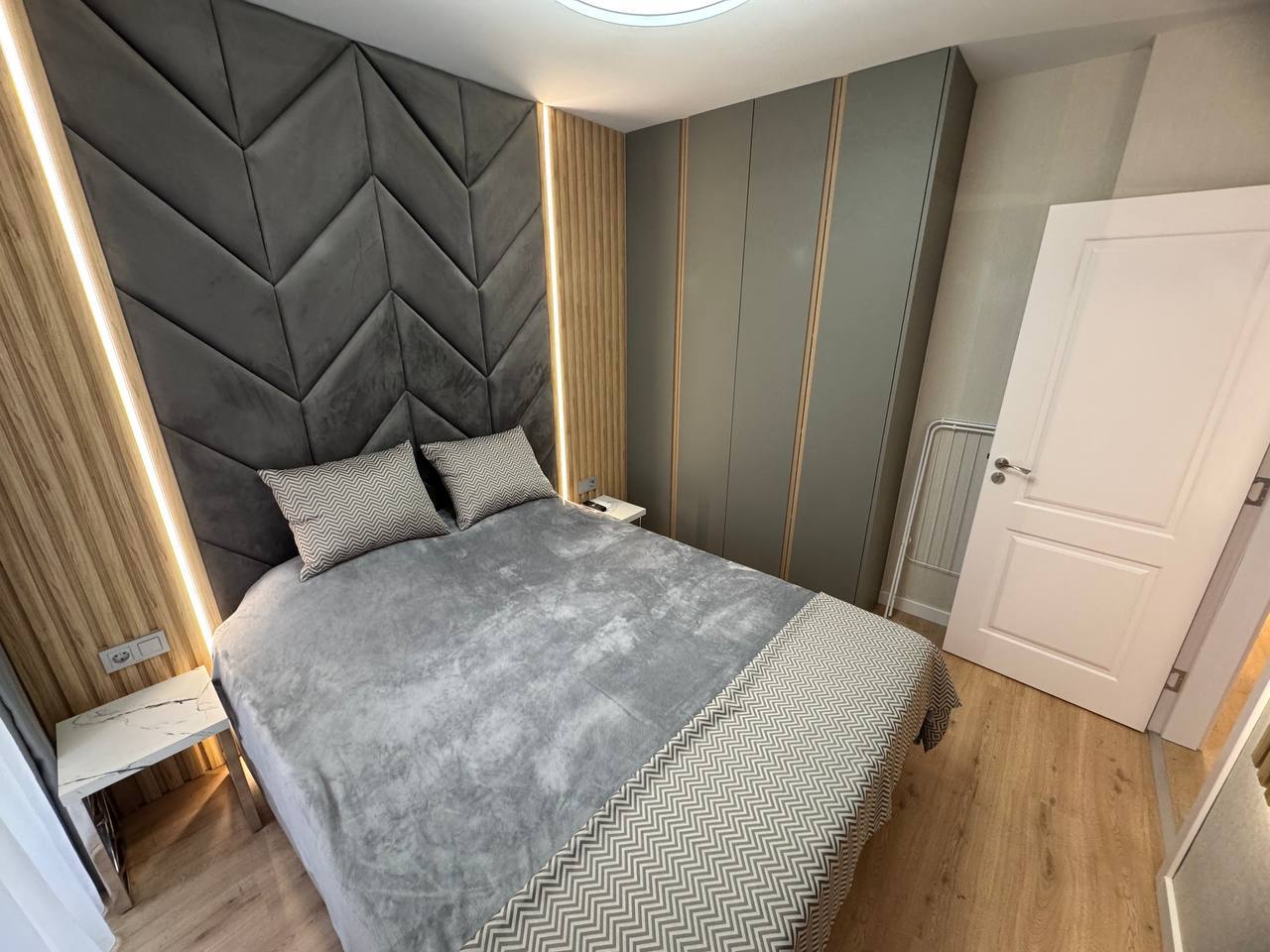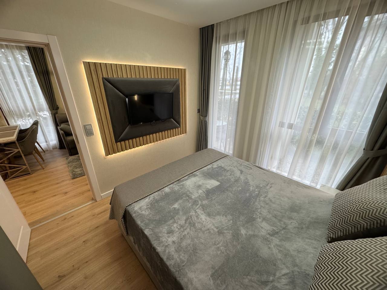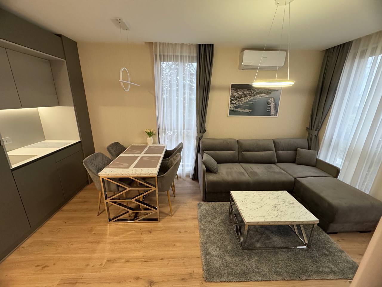 Квартира находится на первом этаже и имеет площадь 45 квадратных метров. Планировка включает гостиную с кухонной зоной и отдельную спальню, что обеспечивает удобное и функциональное пространство. Несмотря на компактный размер, квартира рационально организована, без лишних пустот и «мертвых» зон, что делает ее комфортной для проживания пары или использования в качестве сезонного жилья. Первый этаж обеспечивает быстрый доступ к территории комплекса, что особенно ценно для отдыхающих и арендаторов, предпочитающих отсутствие необходимости пользоваться лифтом.