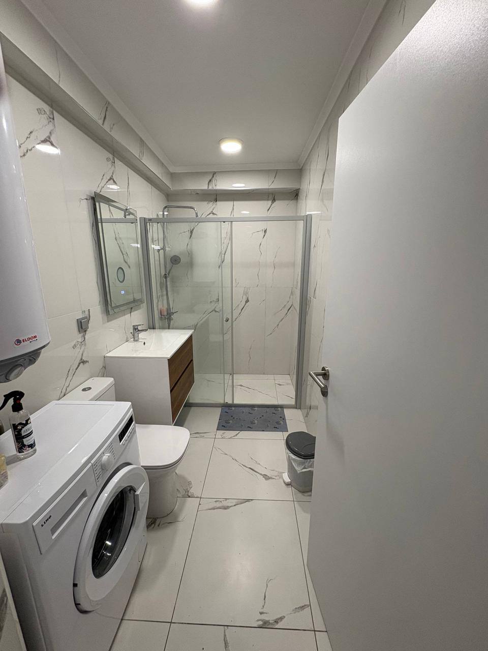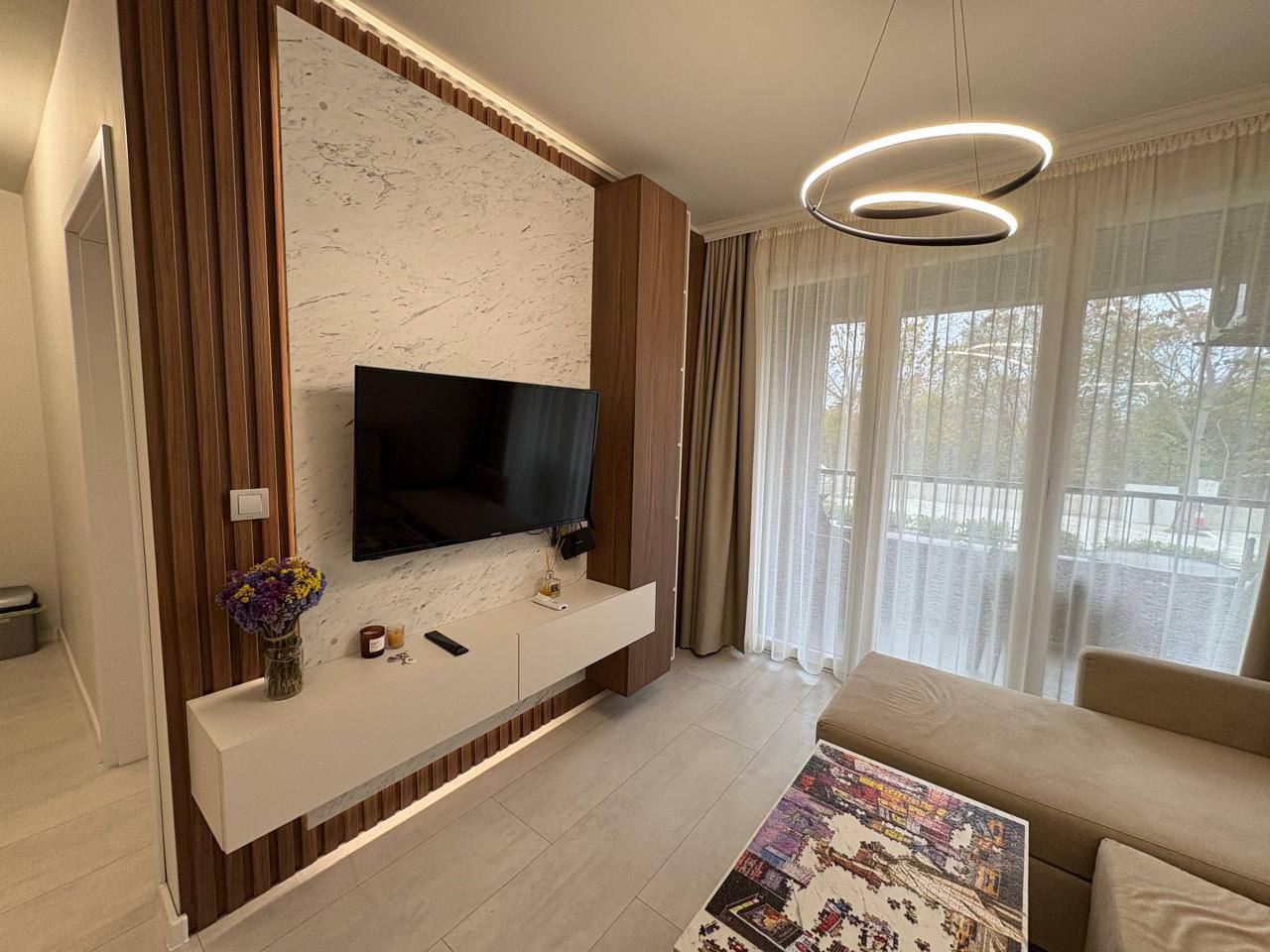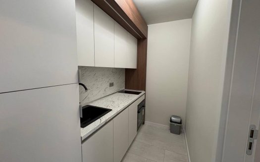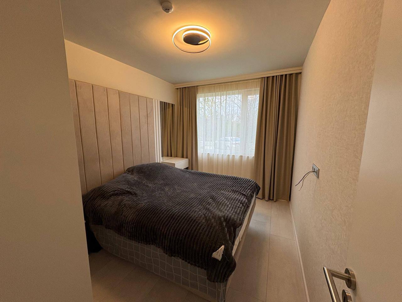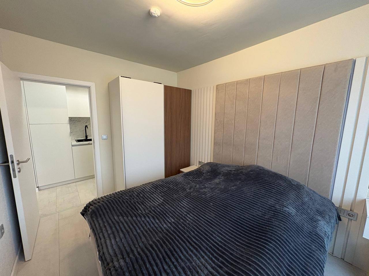 Квартира находится на первом этаже комплекса Domenico и имеет общую площадь 56,8 квадратных метров. Планировка включает просторную гостиную и отдельную спальню, что обеспечивает комфортное размещение для пары или небольшой семьи. Расположение на партере обеспечивает удобный вход без необходимости использования лестниц или лифта, что особенно важно для семей с детьми или пожилых людей. Такой формат квартиры подходит как для жизни, так и для аренды, благодаря продуманному распределению пространства без ощущения тесноты.