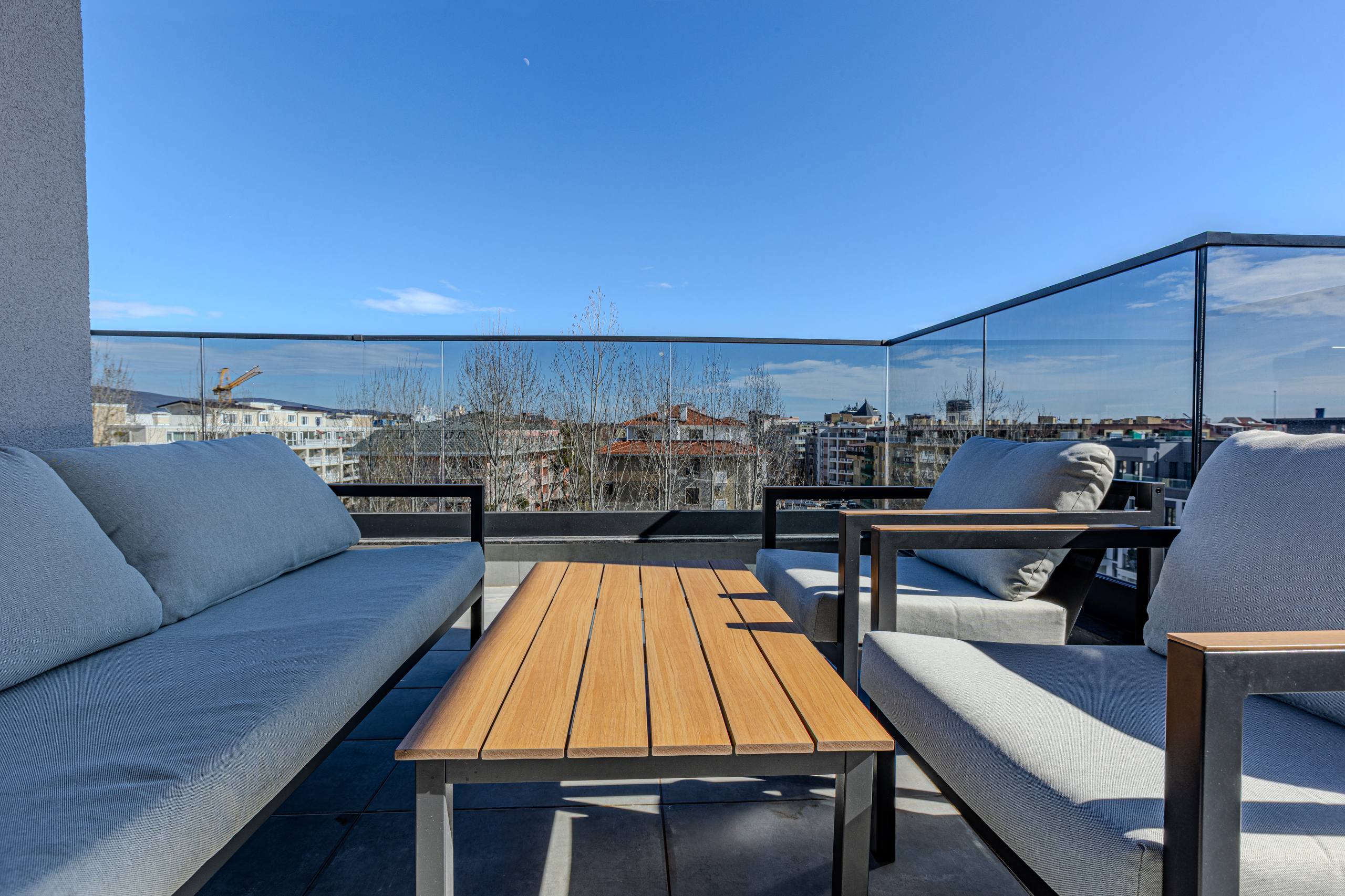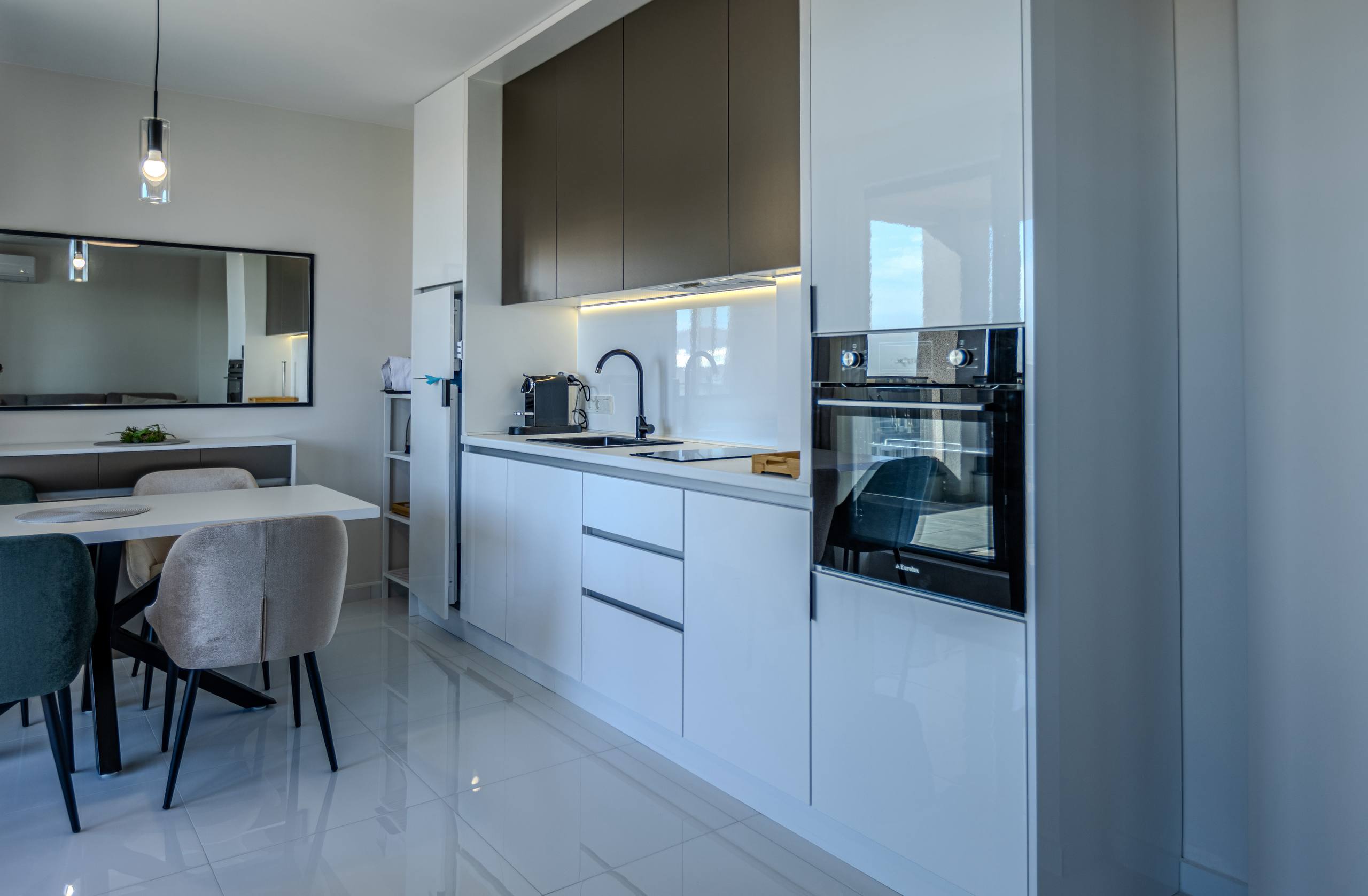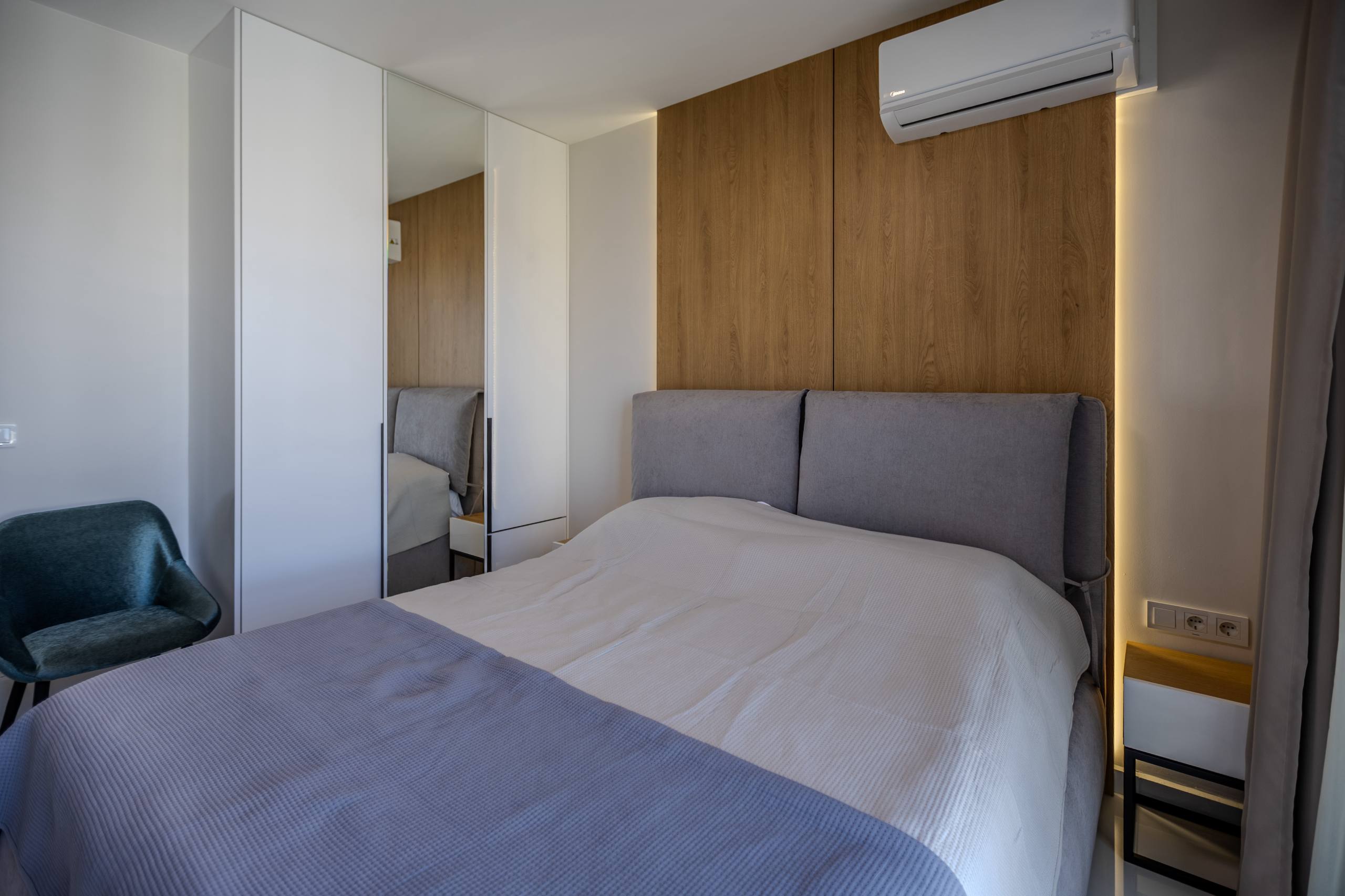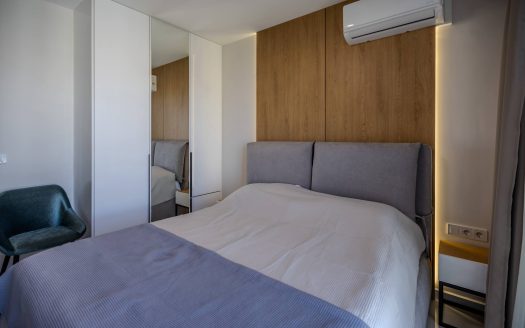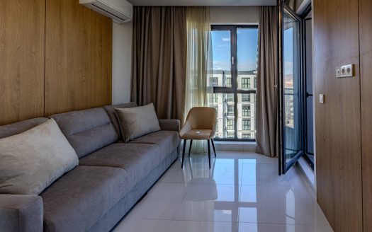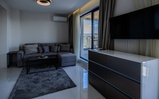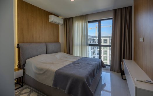 Квартира расположена на шестом, последнем этаже комплекса и занимает площадь 118 м². Планировка включает большую гостиную с кухонной зоной и две отдельные спальни, что создаёт удобное пространство для жизни или аренды. Метраж позволяет организовать полноценные зоны хранения, рабочее место и комфортную обеденную зону без ощущения тесноты. Из окон открываются виды на бассейн комплекса, город и горы, что придаёт квартире дополнительную привлекательность. Объект продаётся с мебелью и оснащён тёплым полом, что обеспечивает комфортное проживание в межсезонье и зимой.