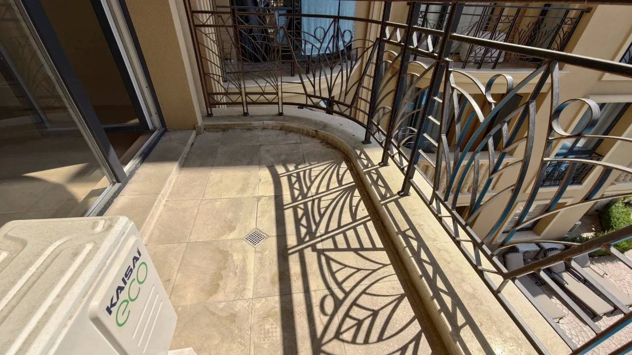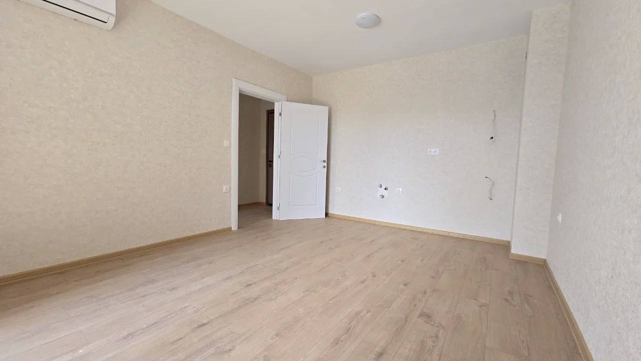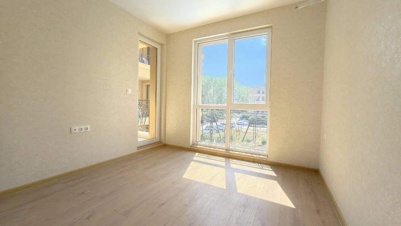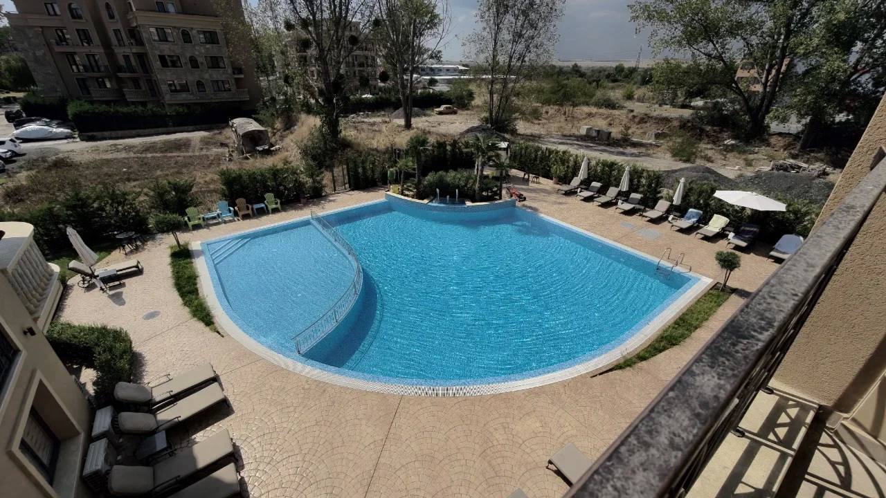 Квартира площадью 52 м² расположена на третьем этаже нового здания, построенного в 2024 году. Планировка включает гостиную с кухонной зоной, отдельную спальню, коридор, санузел и балкон. Такой формат «гостиная + спальня» является наиболее востребованным среди покупателей недвижимости в Болгарии, так как обеспечивает комфорт как для постоянного проживания, так и для сдачи в аренду. Из окон открывается вид на бассейн комплекса, что повышает ликвидность квартиры и привлекательность для арендаторов. Апартамент продаётся без мебели, что даёт возможность оформить интерьер по собственному вкусу.