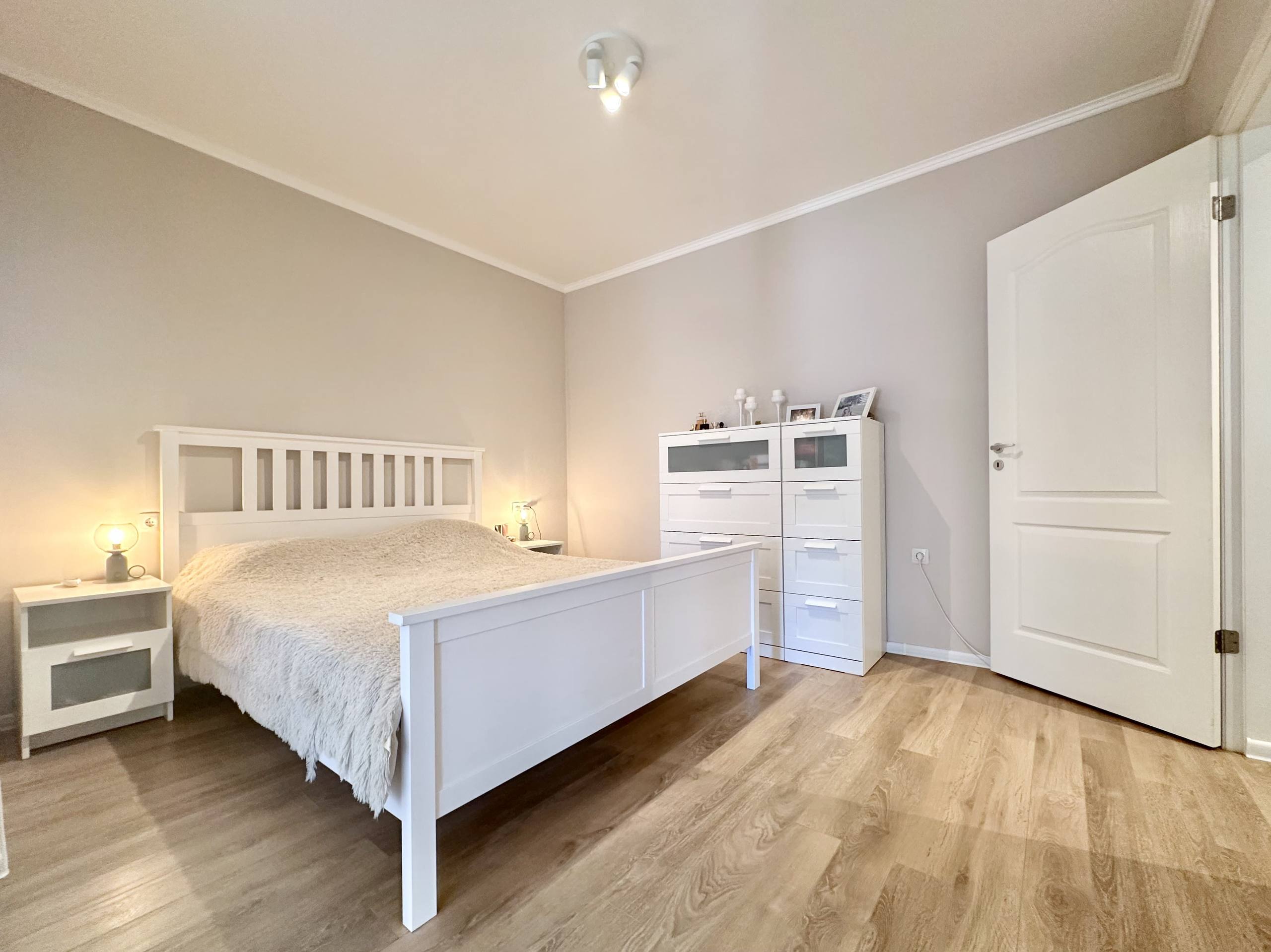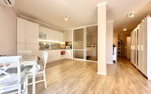 Квартира площадью 86 м² находится на втором этаже комплекса Professor. Планировка включает просторную гостиную с кухонной зоной, отдельную спальню, коридор, санузел и балкон с видом на море. Такой формат обеспечивает удобное и функциональное использование пространства. Светлый интерьер в белых тонах визуально расширяет помещение и создаёт современную атмосферу. Второй этаж считается оптимальным для комфортного проживания, так как обеспечивает хорошее естественное освещение и лёгкий доступ.