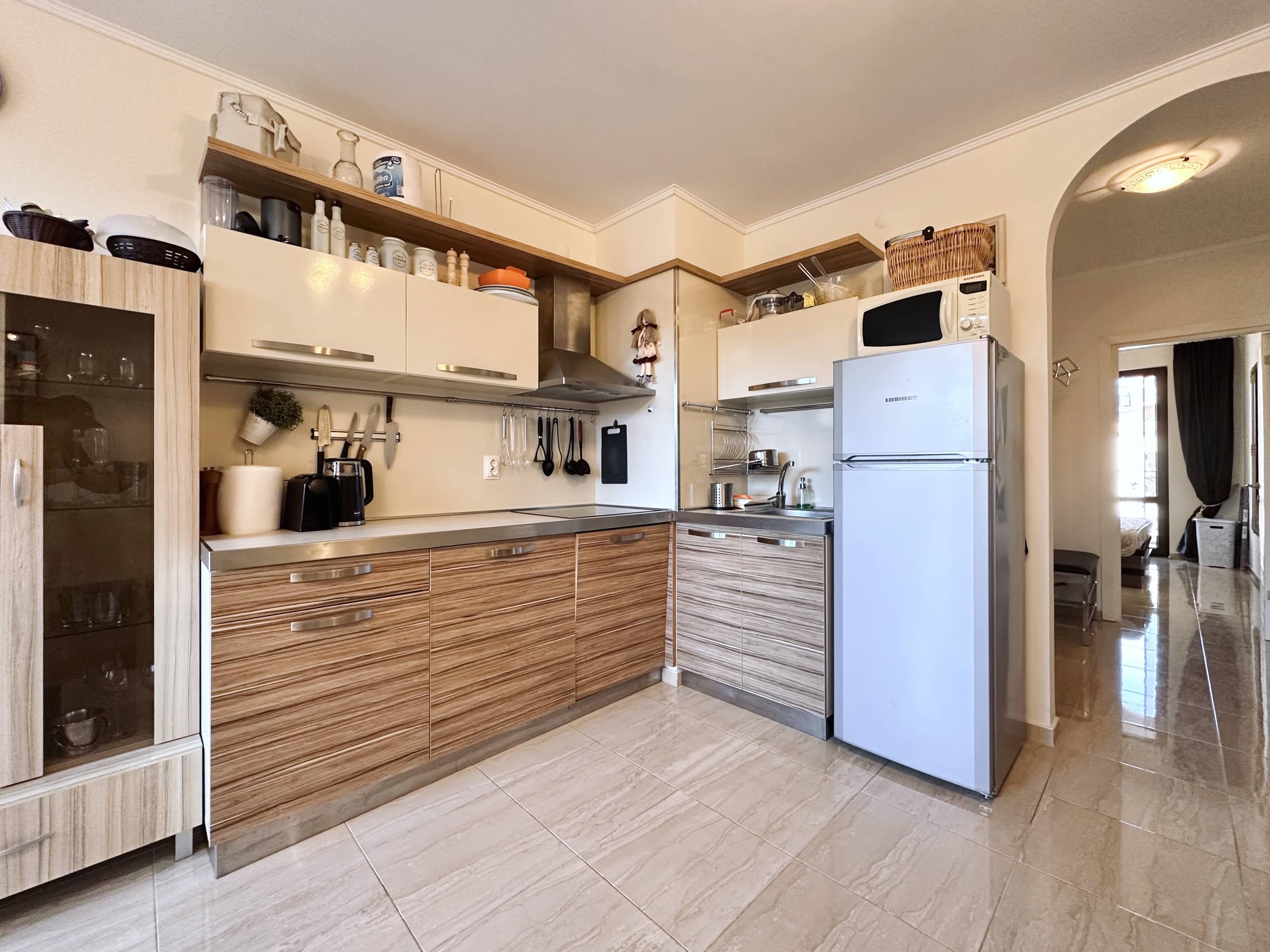 Квартира площадью 74 квадратных метра находится на третьем этаже комплекса Esteban. Планировка включает просторную гостиную с кухонной зоной, отдельную спальню, коридор, санузел и балкон. Такой формат «гостиная + спальня» является одним из самых востребованных на рынке недвижимости в Болгарии, особенно для тех, кто рассматривает покупку квартиры у моря. Третий этаж обеспечивает хорошее естественное освещение и удобный доступ, что делает квартиру комфортной для проживания и привлекательной для аренды.