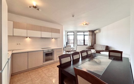 Квартира находится на пятом этаже комплекса Etara 3 и имеет общую площадь 81 квадратный метр. Планировка включает просторную гостиную с кухонной зоной, две отдельные спальни, коридор, санузел и террасу с видом на море. Расположение на верхнем этаже обеспечивает обилие естественного света и открытые панорамные виды на побережье. Такое расположение делает эту квартиру в Святом Власе особенно привлекательной для комфортного проживания и отдыха.