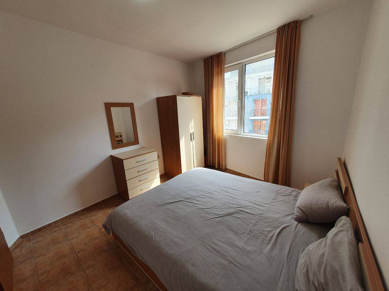Квартира расположена на третьем этаже здания без лифта. Общая площадь составляет 60 м². Планировка включает просторную гостиную с кухонной зоной, две отдельные спальни, ванную комнату с туалетом и террасу. Окна выходят на восток, что обеспечивает приятное утреннее освещение и комфортную температуру в течение дня. Такой формат идеально подходит как для постоянного проживания, так и для сдачи в аренду.