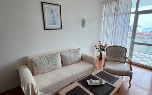 Квартира находится на восьмом этаже здания, что обеспечивает прекрасный вид на море и окружающие пейзажи. Общая площадь составляет 98 квадратных метров, что значительно превышает стандартные размеры квартир с одной спальней и гостиной. Планировка включает просторную гостиную с кухонной зоной, отдельную спальню, коридор, санузел и террасу с видом на море. Высокий этаж и большая площадь создают ощущение простора и света, что делает квартиру удобной как для постоянного проживания, так и для отдыха. Терраса является дополнительным преимуществом, предоставляя возможность наслаждаться морским воздухом и живописными закатами.
