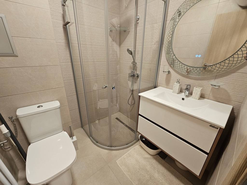 Квартира находится на 4 этаже комплекса и занимает площадь 68 м². Планировка включает просторную гостиную с кухонной зоной, отдельную спальню, коридор, санузел и террасу с видом на море. Гостиная объединяет кухню и обеденную зону, что создаёт комфортное пространство для отдыха и приёма гостей. Большие окна обеспечивают естественное освещение и открывают панорамные виды на море и окружающие пейзажи. Отдельная спальня гарантирует приватность и удобство для проживания. Терраса является дополнительным преимуществом, позволяя наслаждаться свежим воздухом и морским видом в любое время дня.