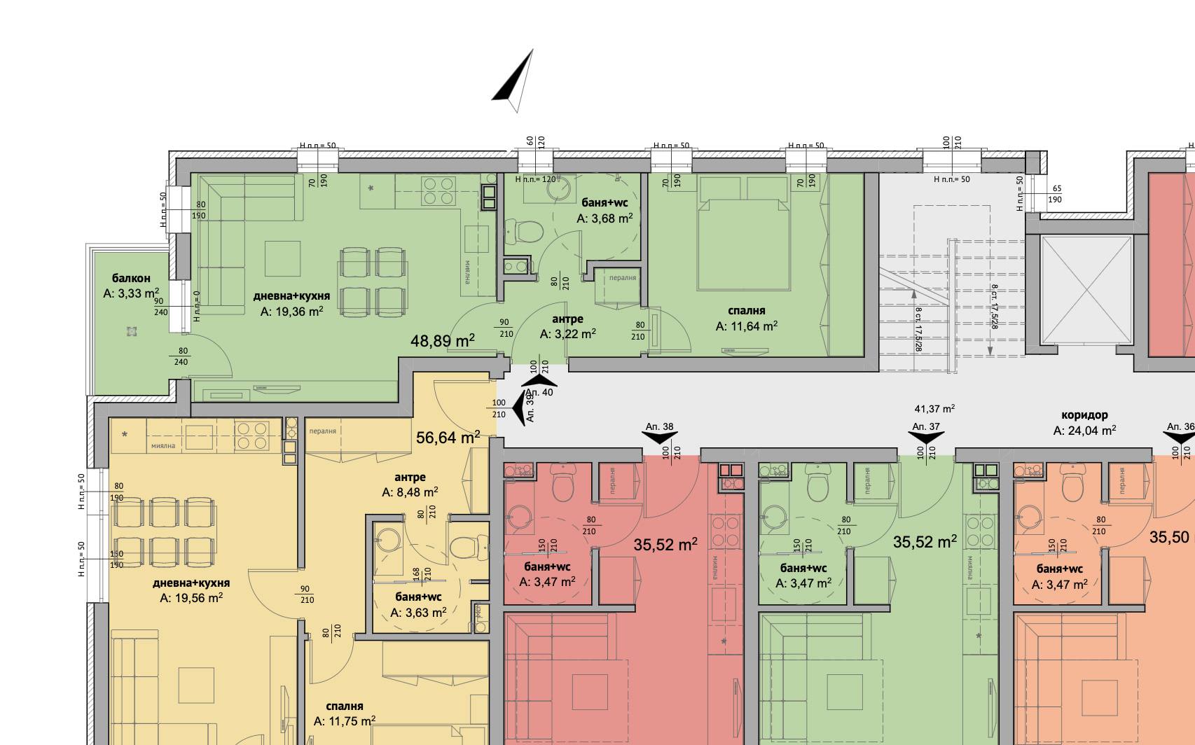 Квартира находится на пятом этаже здания с лифтом, что обеспечивает удобный доступ и комфортное проживание. Общая площадь составляет 54,93 квадратных метра, что является оптимальным размером для двухкомнатного апартамента. Планировка включает гостиную с кухонной зоной, отдельную спальню, ванную комнату с туалетом и террасу. Расположение квартиры на северо-западной стороне обеспечивает мягкое естественное освещение и комфортную температуру в летний период без перегрева. Такой формат идеально подходит для жизни или аренды у моря.